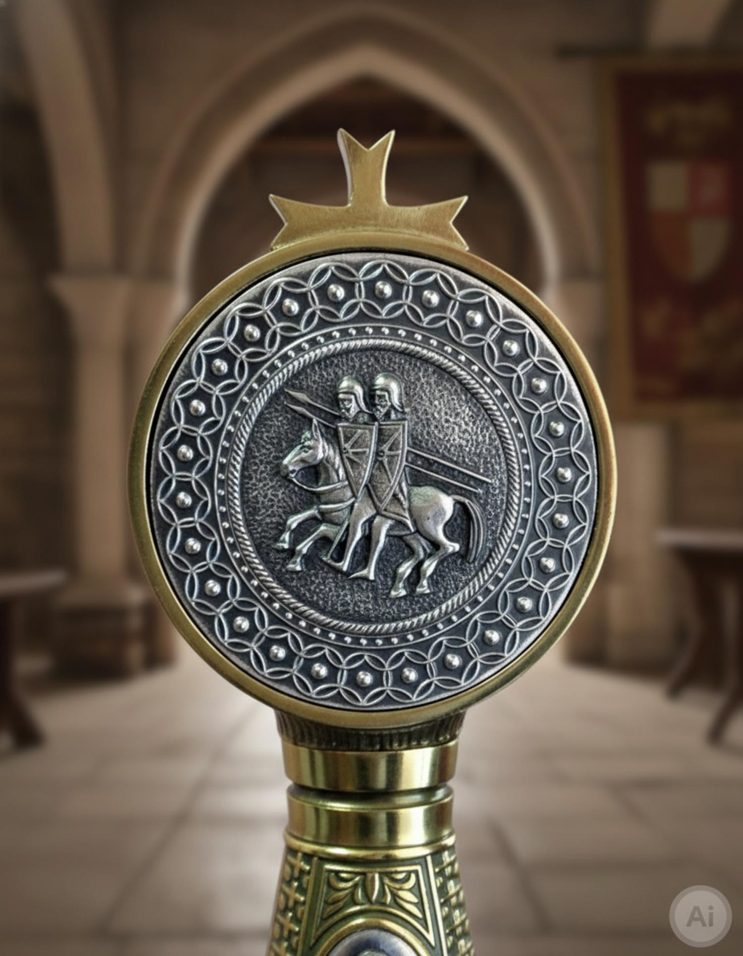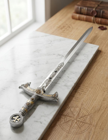 Con i suoi 125 centimetri di lunghezza, la lama in acciaio inossidabile resistente e le incisioni ad acido che ornano il tagliente, è un pezzo che trasmette forza e carattere. Il pomo si distingue con una figura di templari a cavallo, mentre nella guardia appare l'emblematica croce templare, rendendo questa spada un oggetto sia decorativo che cerimoniale, ideale per completare esposizioni o eventi a tema.