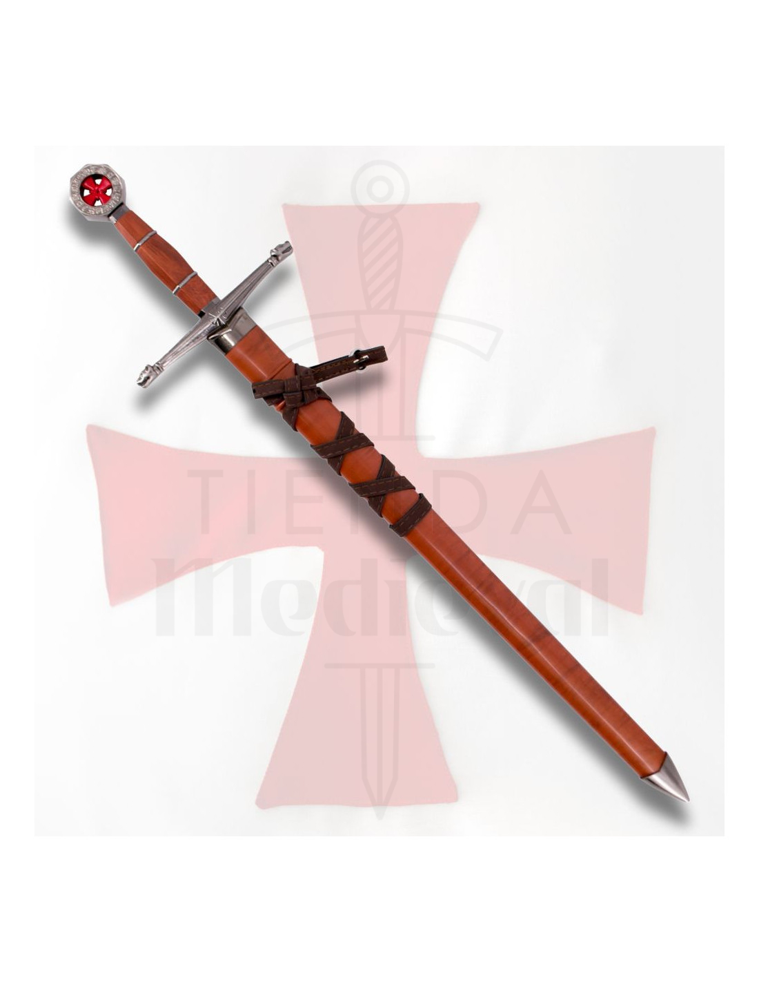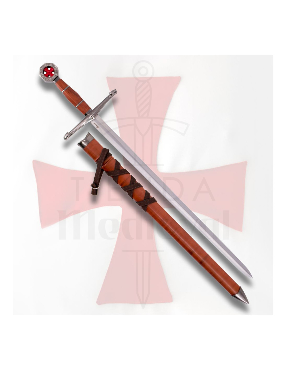 Il pomo e la guardia hanno una finitura lucida in nichel, che si abbina alla impugnatura marrone, offrendo una presa comoda e sicura. Spicca nel pomo una croce templare bianca, un dettaglio che richiama la ricca storia dei cavalieri templari, famosi per il loro coraggio e lealtà. Accanto a questo pezzo, il fodero dall'aspetto in pelle marrone aggiunge funzionalità, permettendo di portare la spada comodamente grazie alla pratica tracolla.
