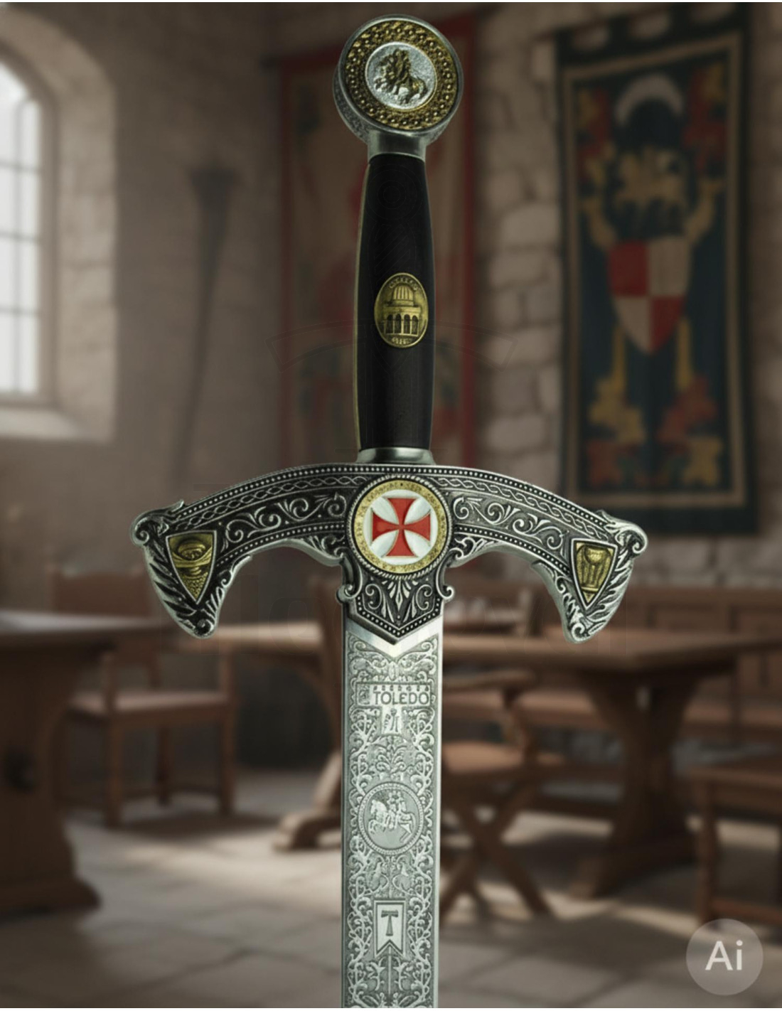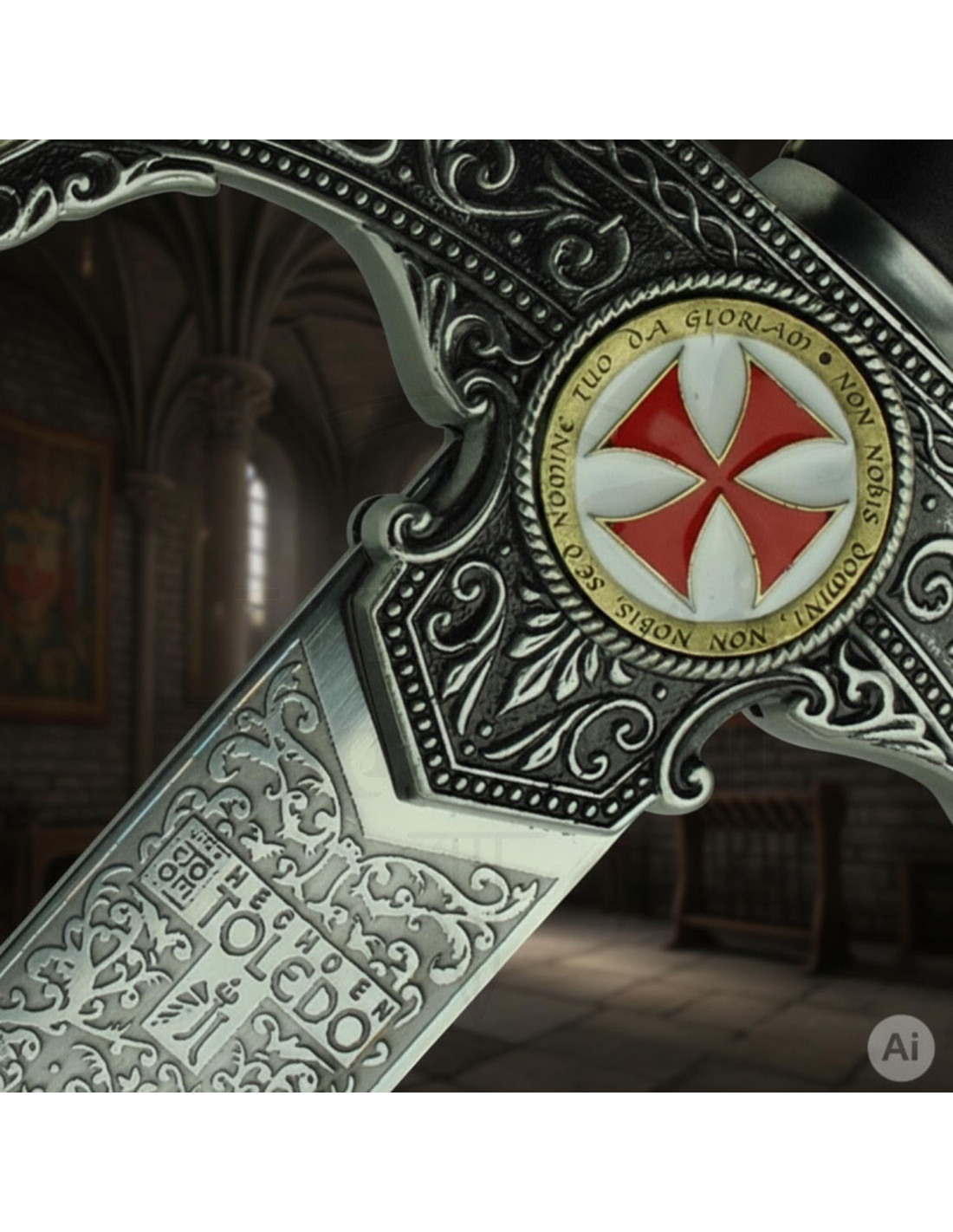 Scopri la Spada Templare decorata, un vero gioiello per gli amanti della storia e della cultura medievale! Questa spada, realizzata interamente a Toledo (Spagna) dal prestigioso spadaio José Luis Rubio, è una vera opera d'arte.