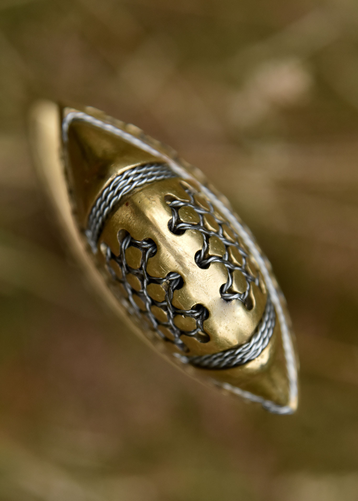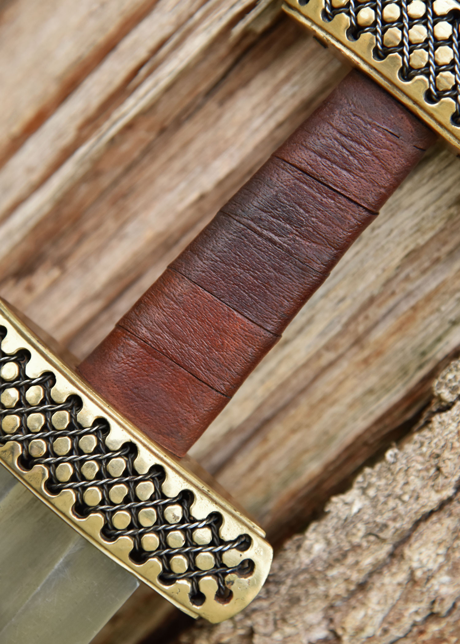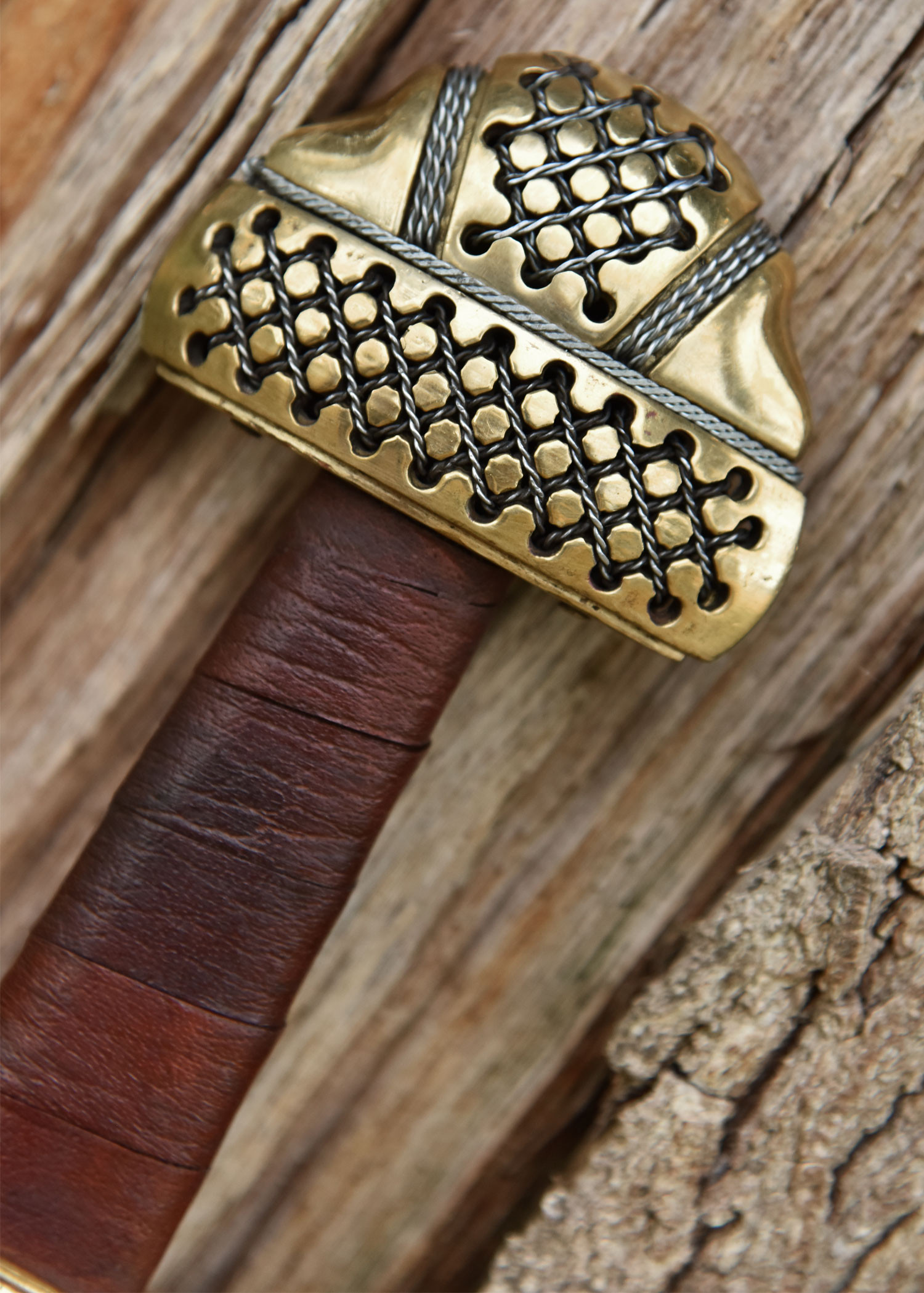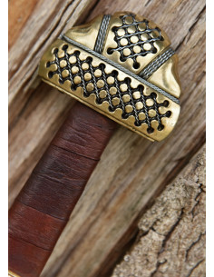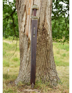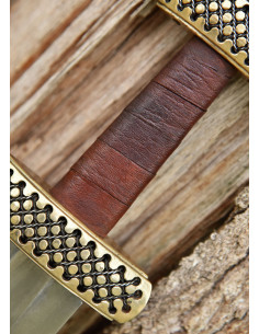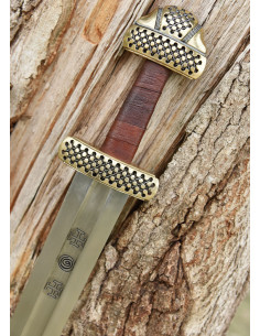 La ricostruzione che vi proponiamo qui è realizzata con una lama in acciaio 1060 ad alto tenore di carbonio temperato a doppio filo dritto con bordi larghi, lunghi, più pieni e non affilati. Le incisioni sono riproduzioni dei segni trovati sulla lama originale. L'elsa è composta da una corta guardia in ottone, un'impugnatura in legno pesantemente rilegata in pelle marrone e un pomello in ottone di dimensioni generose. Anche qui la guardia e il pomo ricreano fedelmente il motivo che adorna il manufatto originale. In questo caso, la guardia e il pomolo sono cavi e forati per facilitare l'infilaggio dei ritagli di filo.
