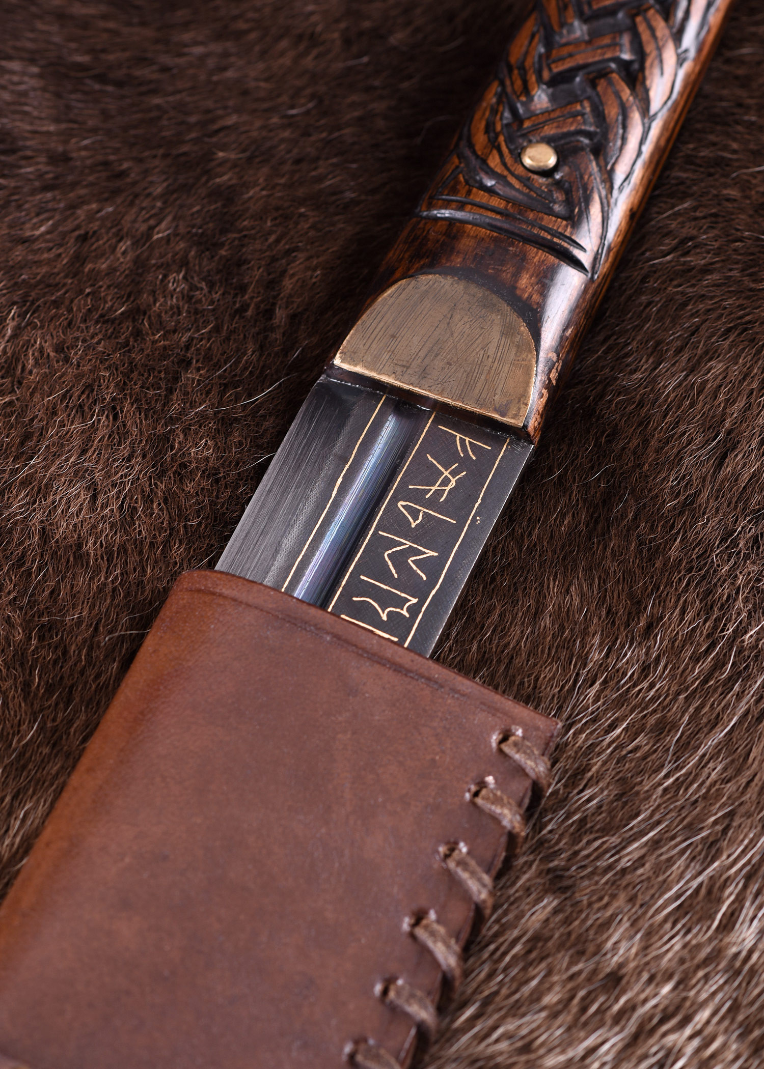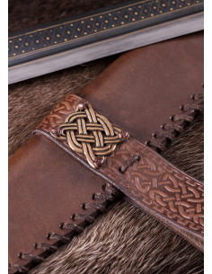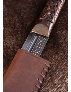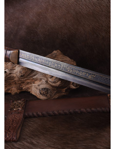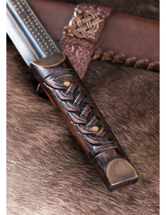 La nostra replica è molto vicina all'originale altomedievale. La lama è realizzata in acciaio di alta qualità e brunita e presenta un'iscrizione runica completa (Futhark) su un lato e la parola Beagnoth sull'altro, che si ritiene sia il nome di chi impugna il coltello o fabbro. Inoltre, l'iscrizione è intarsiata con oro e argento, proprio come l'originale. La lama ha un unico filo e una scanalatura stretta ma profonda. Il manico in legno è saldamente rivettato al codolo della lama con rivetti in ottone. Include un autentico fodero in pelle bovina con hardware a nodo per una conservazione sicura. Inoltre viene fornito con un supporto da parete in legno e un certificato di autenticità numerato!