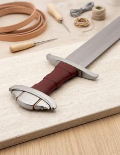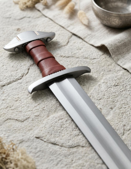 Il manico, avvolto secondo la tecnica storica di avvolgimento umido, lascia un'impronta sulla pelle che migliora la presa e offre una texture calda e sicura al tatto, anche durante un uso prolungato. Dettagli insoliti nelle repliche, come gli spaziatori decorativi tra l'impugnatura, il pomolo e la guardia, apportano un'attrattiva visiva autentica e una presenza unica in qualsiasi collezione. Il pomolo arrotondato e la guardia curva proteggono la mano senza compromettere la mobilità, mantenendo l'ergonomia in ogni manovra.