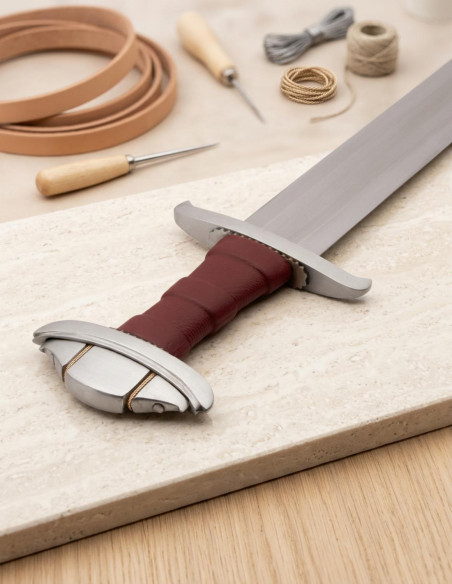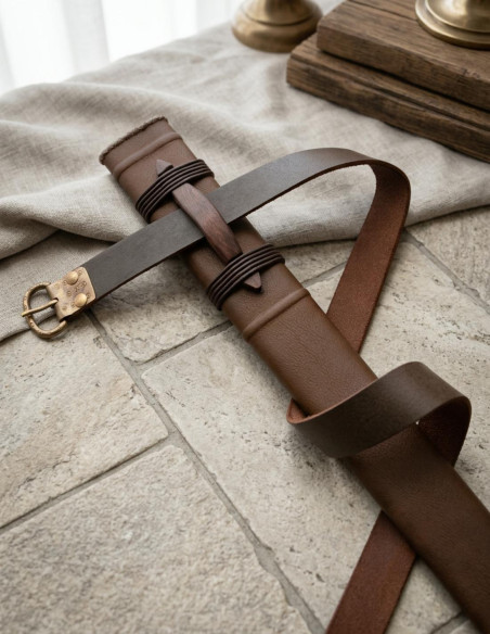 È inclusa una fondina d'epoca con nucleo in legno rivestito in pelle marrone e una tracolla regolabile con fibbia metallica per indossarla con sicurezza e stile. Questa fedeltà all'originale conservato nel National Museum of Ireland, trovato vicino ad Askeaton a Limerick, aggiunge un valore storico che collega la replica all'eredità del periodo vichingo.