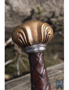Misura 75 cm di lunghezza, questa spada presenta una lama a doppio taglio di 58 cm con una cresta centrale. Il suo manico è meticolosamente realizzato, con una guardia a croce ricurva e un pomo a tre punte, che ricorda le spade vichinghe nude. Sia il crossguard che il pomo sono dipinti a mano per conferire loro un aspetto sbiadito di ferro e bronzo.