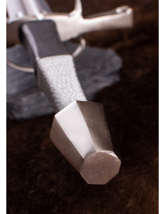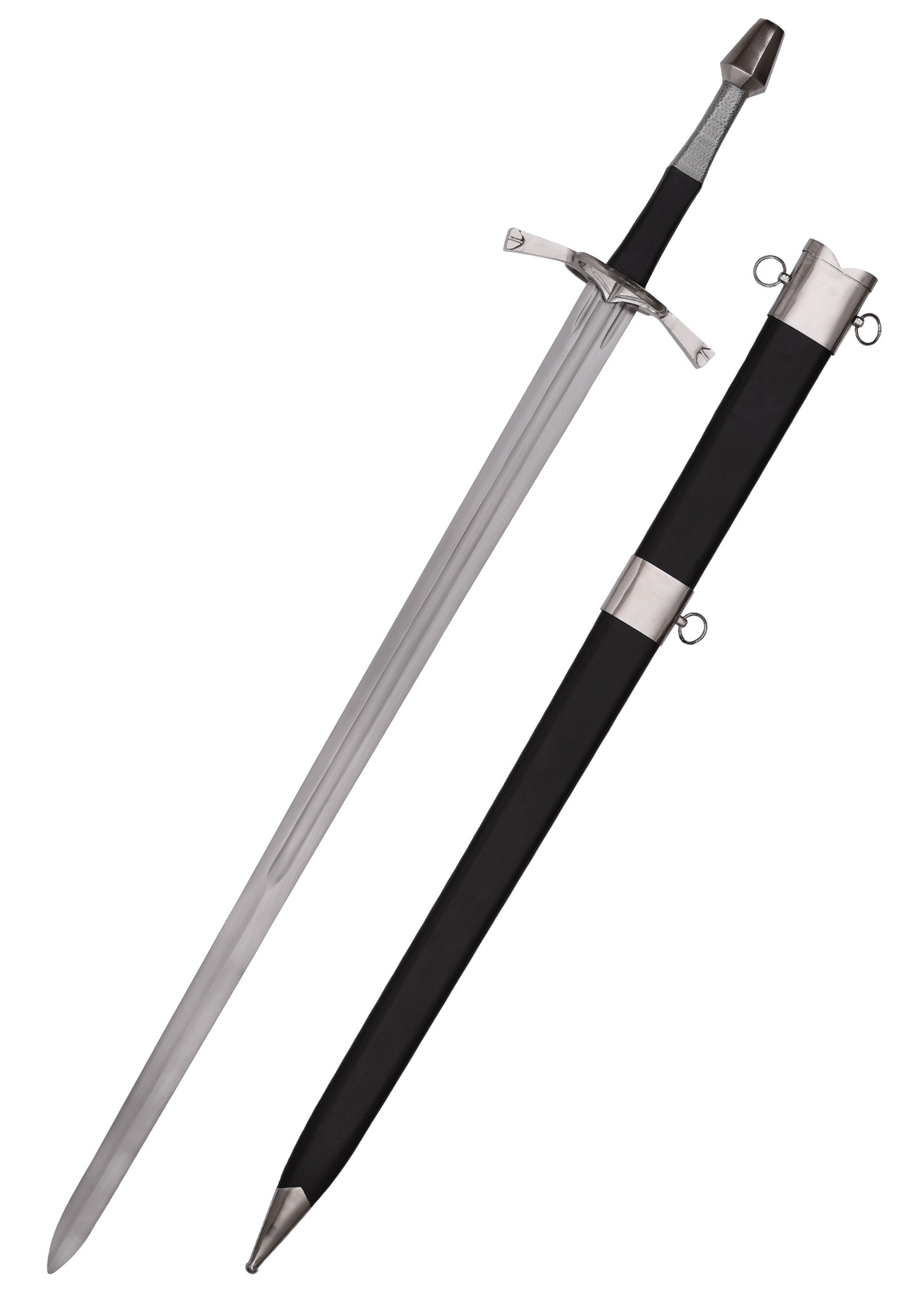Spada lunga medioevale-rinascimentale con anello e fodero dal design ispirato ai modelli in uso nel XV secolo. La lunga, larga lama a doppio taglio della spada medievale qui offerta si assottiglia leggermente verso la punta. È forgiato in acciaio per molle EN45 e ha più fuller su ciascun lato (un fuller principale incorniciato da due corti, una caratteristica comune a molte spade Oakeshott Type XX). I bordi non sono affilati e l'intero codolo della lama è avvitato al pomo. L'elsa cruciforme sfoggia un pomo del tappo del profumo rovesciato di dimensioni generose e un ca. Parafango a croce leggermente curvo lungo 19 cm con anelli di arresto a forma di D, tutto in acciaio. L'impugnatura è costituita da un'anima in legno rivestita in pelle e acciaio: mentre la prima metà adiacente alla guardia è rivestita in pelle nera, il resto dell'impugnatura è avvolto in filo di acciaio intrecciato.