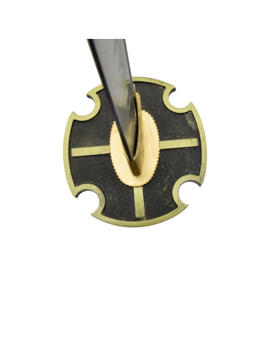Diventa un eroe fantastico con la spada corta Ysaria, un'arma magnifica progettata appositamente per personaggi come gli elfi. Il suo design elegante e la sua meticolosa lavorazione si distinguono per i dettagli accurati, inclusa una decorazione dorata sul pomo che le conferisce un'aria di sofisticazione. La lama, sottile e leggermente curva, non solo mette in risalto la grazia di questa spada, ma la rende anche uno strumento funzionale per il combattimento.