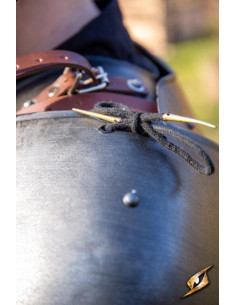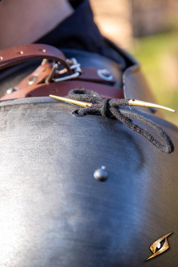 Le spalline si fissano saldamente con cinghie in pelle attorno ai bicipiti e sulla spalla, garantendo una vestibilità comoda e sicura. Inoltre, i cinturini e l'hardware in pelle cromata aggiungono un tocco di stile in più a questo pezzo di armatura. Non solo ti sentirai protetto, ma sembrerai anche incredibilmente elegante mentre combatti.