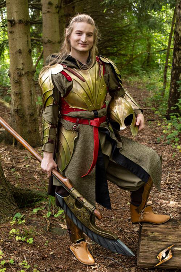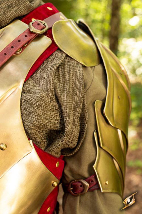 Questa armatura di alta fantasia è assicurata stringendo le cinghie di cuoio intorno alle braccia. Realizzato in acciaio dolce spesso 1 mm e cinturini e accessori in pelle pieno fiore, questo pezzo di armatura è rifinito con una placcatura in ottone che gli conferisce un aspetto particolarmente regale. Con una cura regolare per armature in pelle e metallo, durerà per molte stagioni.