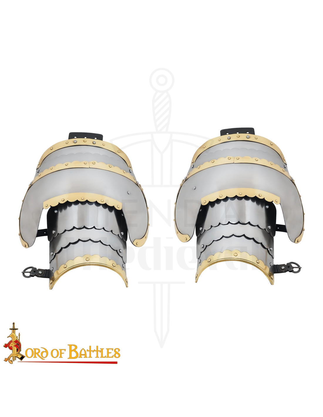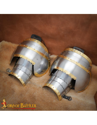 Se cerchi un tocco autentico di cavalleria medievale, queste spalline in acciaio con bordature in ottone ti offriranno un aspetto imponente e ricco di storia. Ispirate all'armatura dei famosi Hussar del XVI e XVII secolo, queste pezzi non sono solo una protezione potente, ma anche un'opera artigianale. La loro finitura in acciaio lucido, decorata con dettagli in ottone, crea un contrasto visivo che eleva qualsiasi abbigliamento medievale, teatrale o di ricostruzione storica.