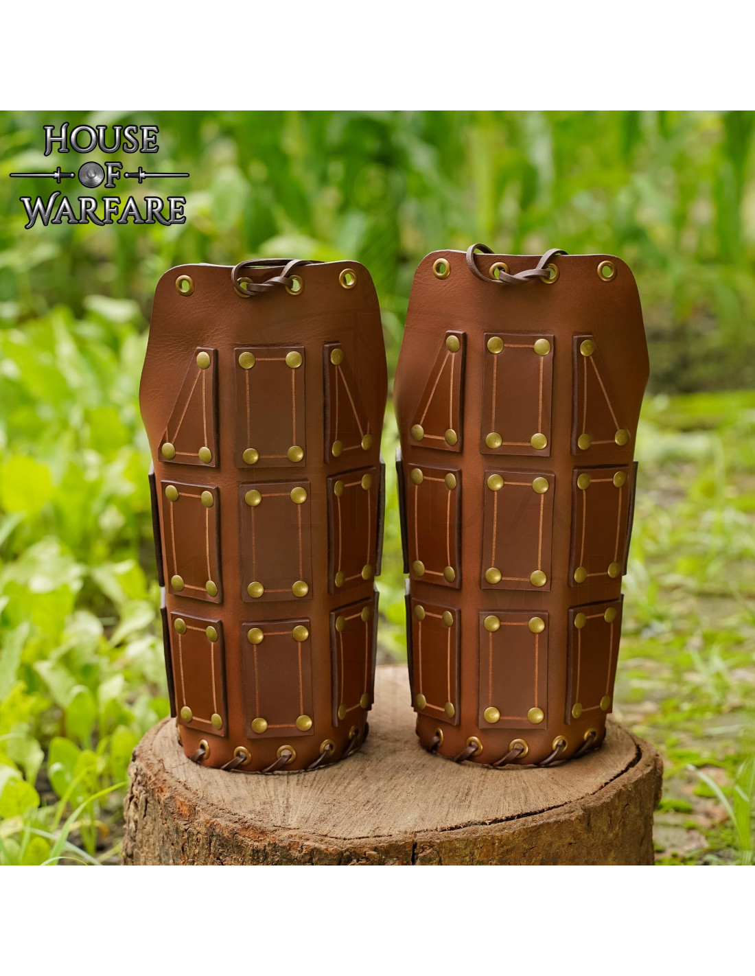 Nell'immagine si osservano bracciali in pelle marrone con placche e chiodi dorati, lacci di regolazione e una leggera curvatura per maggiore comfort, dettagli che riflettono lo stesso linguaggio estetico e funzionale di questo modello Bohemond, fornendo coerenza visiva se si cerca di completare il proprio equipaggiamento.