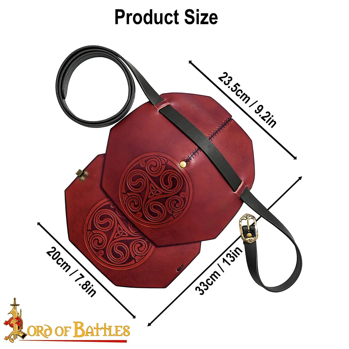 La finitura cerca impatto visivo e durabilità più che uso in combattimenti intensi, perciò è ideale se desideri completare un abbigliamento vichingo, medievale o fantasy con un pezzo che sembri uscito da un laboratorio tradizionale. Nelle immagini si apprezza come armonizza con accessori artigianali, come una borsa ottagonale in cuoio marrone rossiccio con dettagli neri, chiusura metallica a scatto, cinghia nera regolabile con fibbia dorata incisa, e borchie decorative, il che ti permette di creare abbinamenti coerenti e con uno stile autentico.