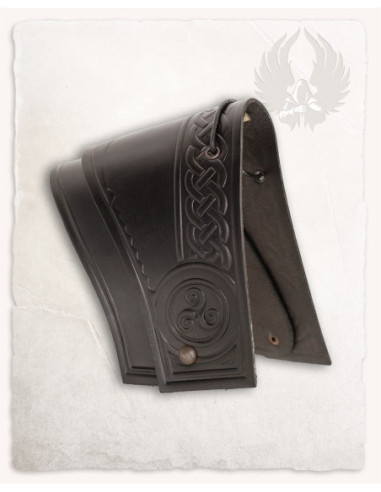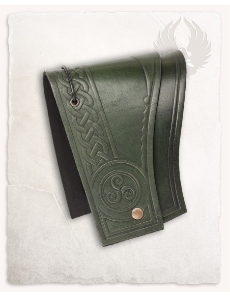 La finitura in pelle verde scuro, con una patina lavorata, conferisce profondità e carattere a ciascun pezzo, mentre l'interno in tonalità naturale offre un contatto più morbido con la pelle per un uso prolungato. Il rilievo con nodi celtici e il triskelion centrale esaltano la personalità del insieme, aggiungendo un punto focale che viene apprezzato sia da vicino che da lontano. Un bordo definito e un piccolo rivetto metallico rinforzano il contorno, aggiungendo dettaglio visivo e sensazione di autenticità.