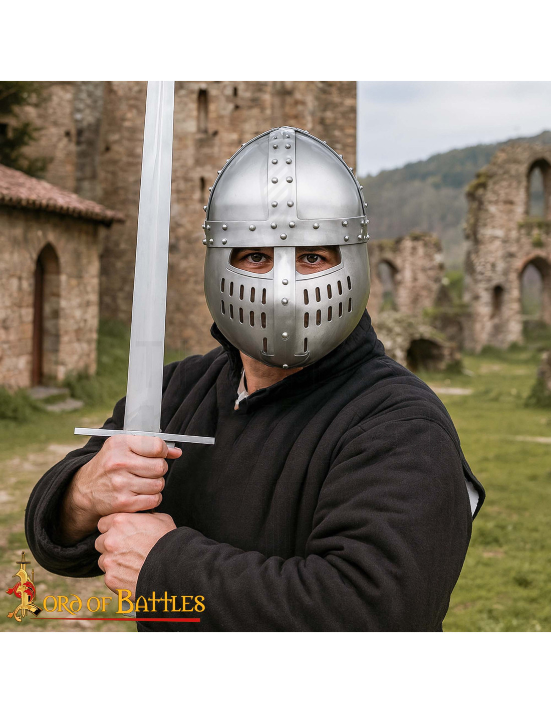 Realizzato in acciaio dolce da 16 gauge, combina la sicurezza contro colpi, frecce e ferite con un peso gestibile per un uso prolungato. La cupola segmentata e rivettata garantisce durabilità e autenticità, mentre la visiera e il barboquejo in cuoio con fibbia assicurano una vestibilità comoda e sicura in ogni situazione, dalle ricostruzioni storiche alle esposizioni o eventi LARP.