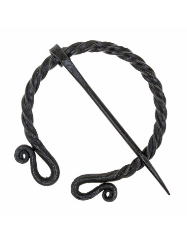 Questo pezzo forgiato a mano presenta un anello formato da due barre attorcigliate che disegnano un'omega perfetta, rifinite con spirali decorative, e un lungo ago che si infila all'interno dell'anello per una chiusura pulita e ferma. La superficie opaca di tono nero e la texture leggermente rugosa rinforzano quella presenza rustica, ideale per chi cerca un accessorio con carattere che non richiami l'attenzione in modo ostentato.