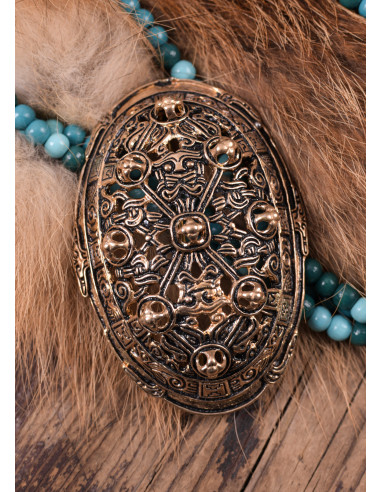 Non si tratta solo di stile; questo capolavoro è robusto e affidabile, perfetto per ogni occasione. La qualità della sua lavorazione assicura che rimanga al suo posto anche nei giorni più ventosi. Osa abbinarlo a mantelli di tonalità profonde o brillanti che esaltano la bellezza del bronzo, e porta con te lo spirito indomabile dei vichinghi.