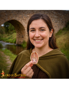Tradizionalmente usata in coppia per fissare le bretelle dei vestiti, questo accessorio evoca lo stile indossato dalle donne vichinghe, che spesso lo adornavano con catene decorative o spille complementari.