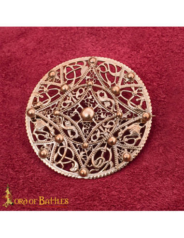 Questa spilla combina la ricchezza della filigrana nordica con un brillante dorato morbido, e il suo design traforato rivela un motivo simmetrico di nodi in stile Urnes, con una pallina centrale in evidenza circondata da altre più piccole e un bordo dentato che apporta personalità visiva. Nella foto, il metallo contrasta su un tessuto color granata, esaltando la sua presenza e facilitando il suo risalto su strati e manti.