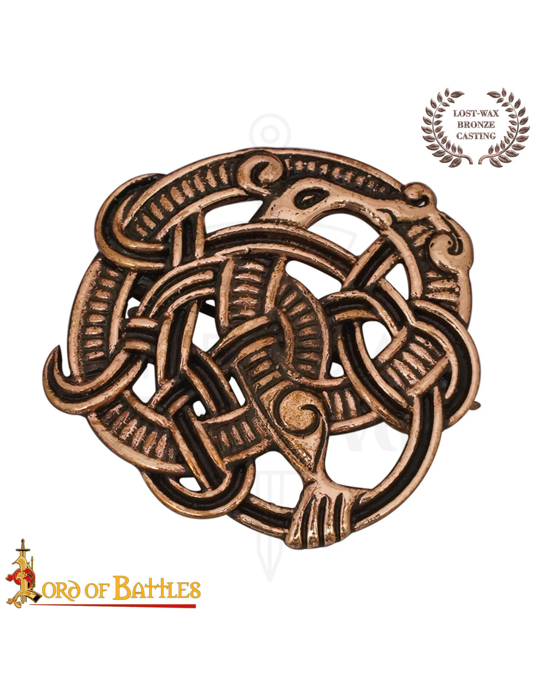 Questa fibbia nasce da una tradizione ancestrale, creata mediante la tecnica della cera persa, che garantisce che ogni esemplare sia unico e conservi dettagli minuti che rievocano motivi dei secoli IX all'XI. Le figure animali intrecciate e le linee incise apportano una texture viva, mentre la lucentezza e le zone con patina esaltano i rilievi, offrendo un aspetto invecchiato che racconta storie ad ogni riflesso.