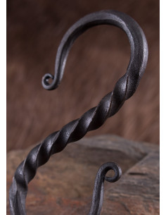 Presenta una sezione centrale attorcigliata e estremità rotonde forgiate e laminate. Questo gancio di ferro è stato lasciato nella sua finitura naturale e lo strato di scaglie caratteristico della forgiatura gli conferisce un aspetto autentico. Misurando circa 10 x 4,5 cm e con una larghezza di apertura di circa 1,5 cm, questo gancio in acciaio forgiato a mano è un'ottima aggiunta a qualsiasi collezione di strumenti medievali e rinascimentali.