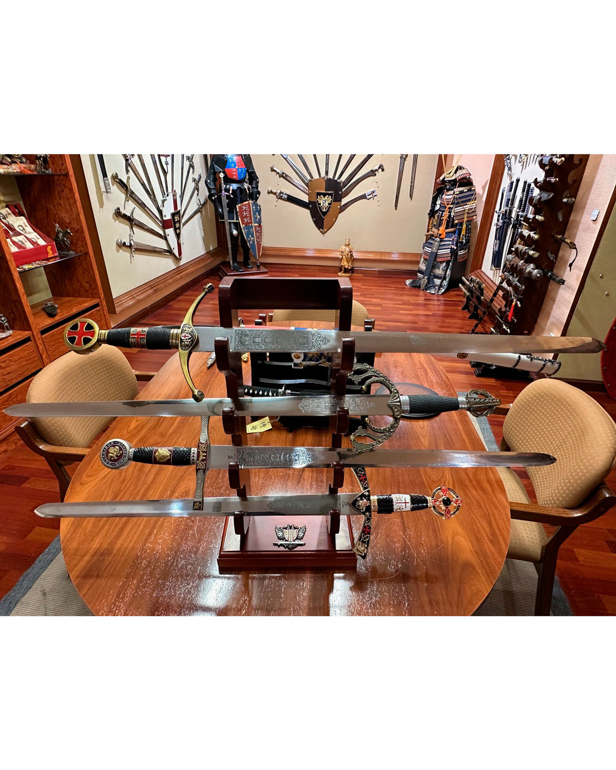Il legno lavorato a Toledo offre una sensazione calda e una finitura che mette in risalto ogni lama, garantendo al contempo una base stabile che protegge i pezzi da colpi o movimenti accidentali. Il risultato è una presentazione curata che trasmette rispetto per l'artigianato e per ciascuna arma esposta.