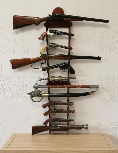 Vuoi esporre la tua collezione di pistole in modo da impressionare e mettere in risalto la tua passione? Questo espositore per 12 pistole ti permette di mostrare le tue repliche preferite con eleganza e ordine, facendo di ogni pezzo il centro dell’attenzione. La bellezza del suo legno e le dimensioni compatte rendono facile posizionarlo in qualsiasi angolo della tua casa o spazio espositivo. Inoltre, essendo realizzato in Spagna, garantisce durabilità e un finissaggio perfetto che dura nel tempo.