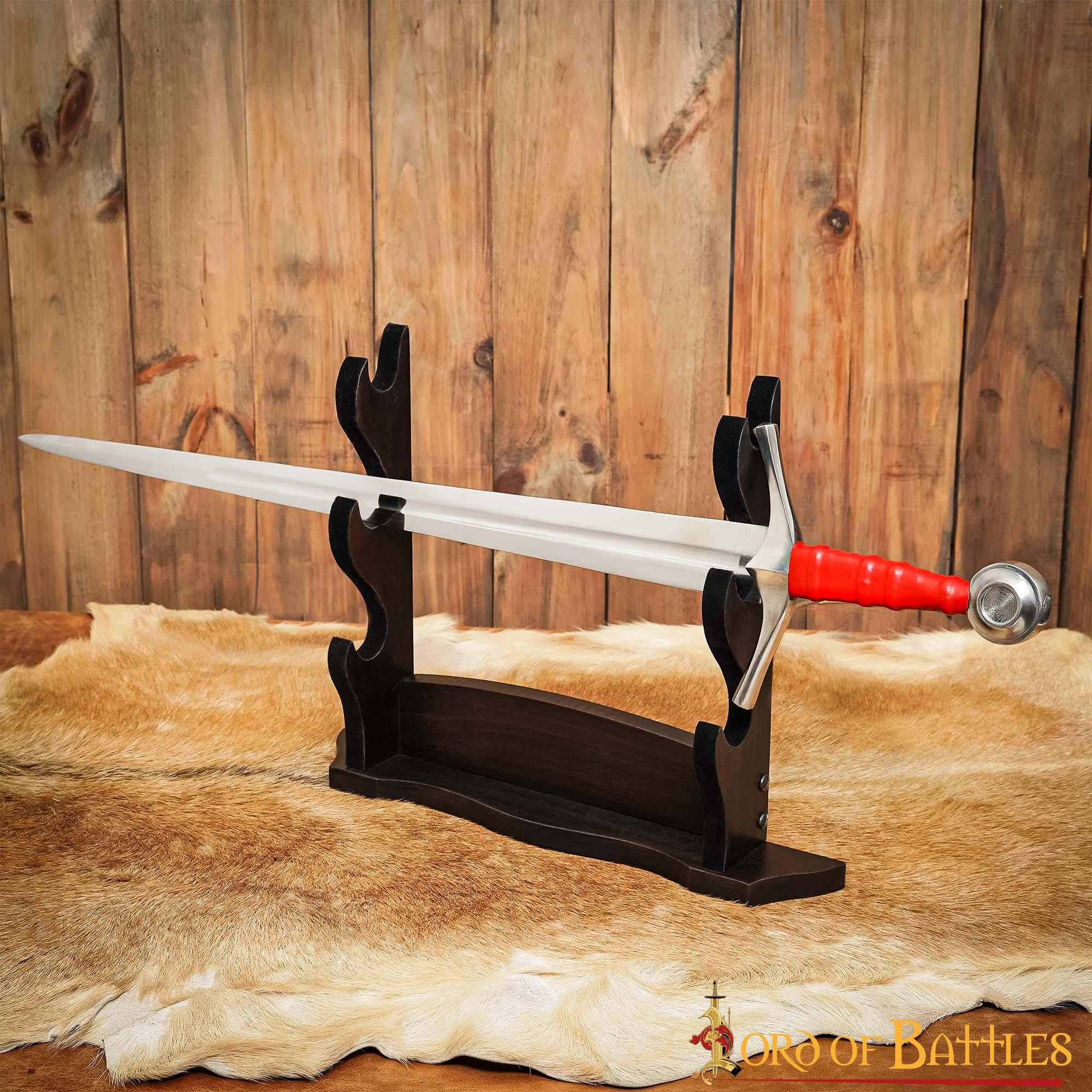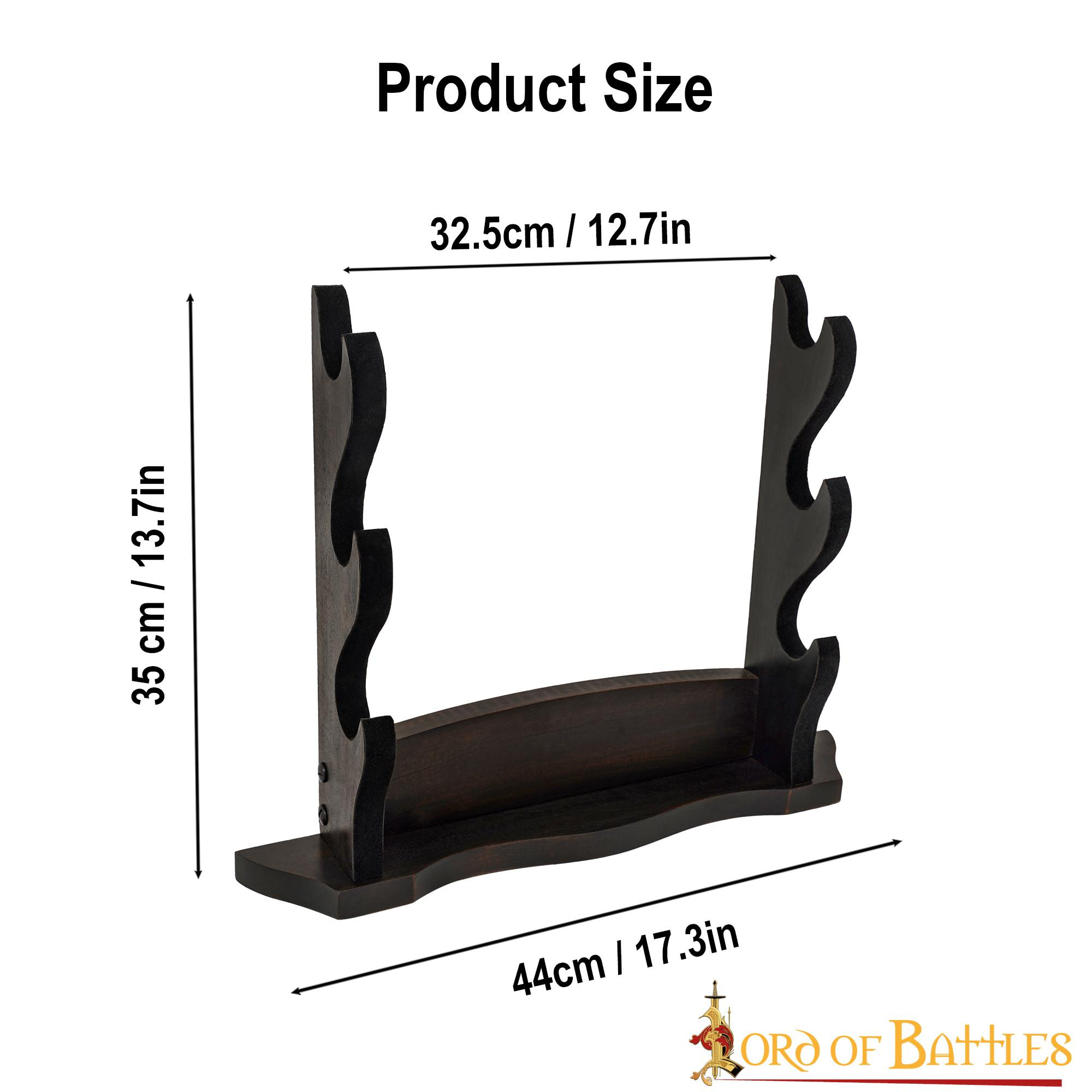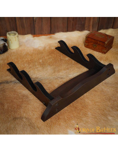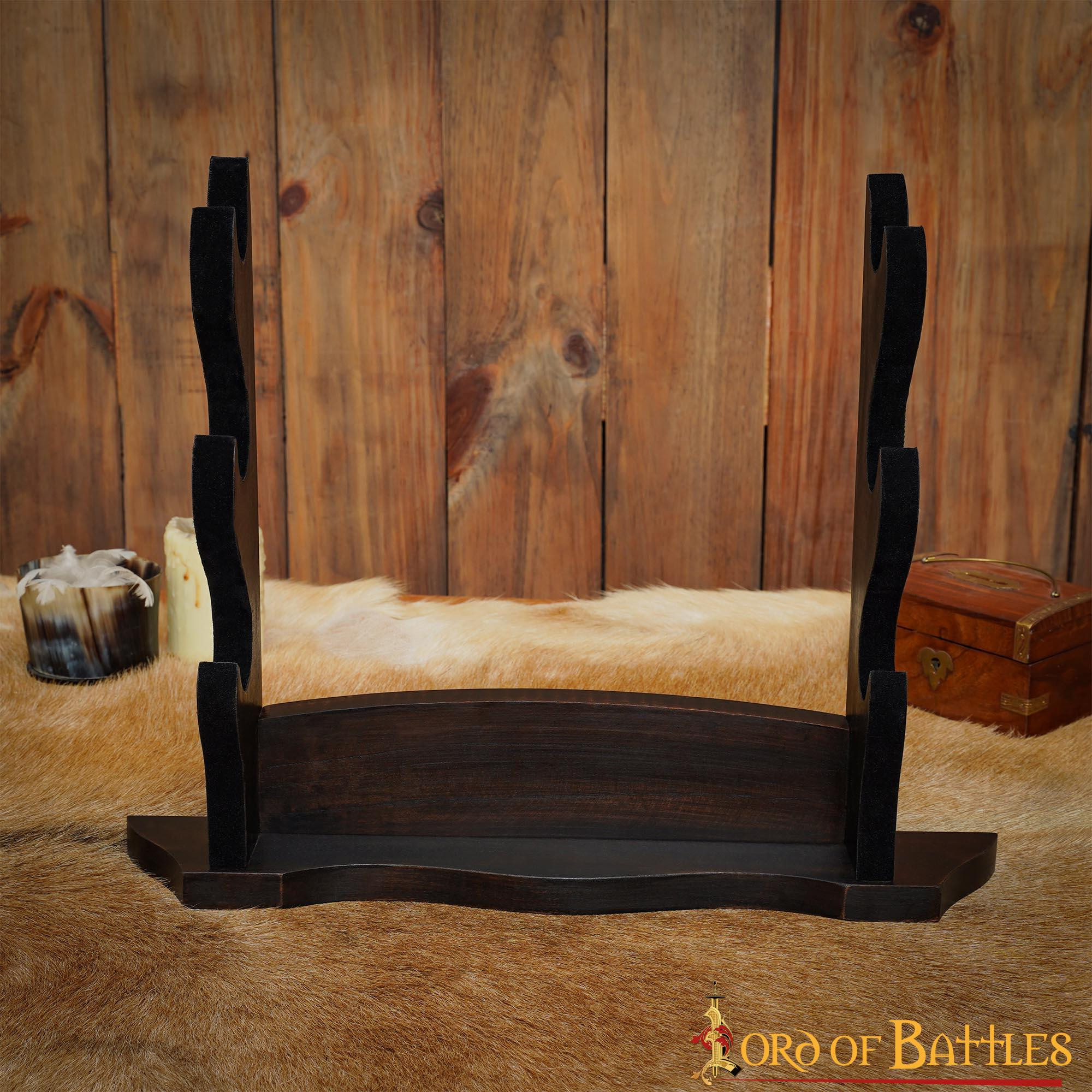Dai alle tue asce e spade il riconoscimento che meritano con il nostro supporto da tavolo a tre livelli in autentico legno lavorato a mano! Progettato con passione e precisione, questo supporto è l'opzione perfetta per esporre le tue armi con orgoglio e stile.