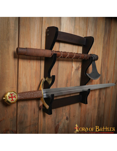 Questo supporto non è solo funzionale, ma anche un elemento decorativo ideale per dare un tocco personale al tuo ufficio, soggiorno o biblioteca. Se sei un intenditore che apprezza le armi storiche o semplicemente qualcuno che vuole aggiungere uno straordinario elemento decorativo alla tua casa, questo supporto è perfetto per te. Mostra le tue spade e asce con orgoglio e goditi un pezzo che non solo organizza, ma racconta anche storie.