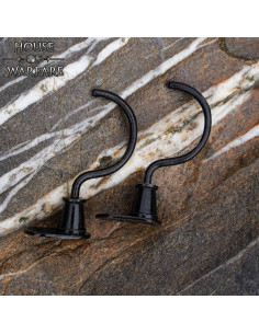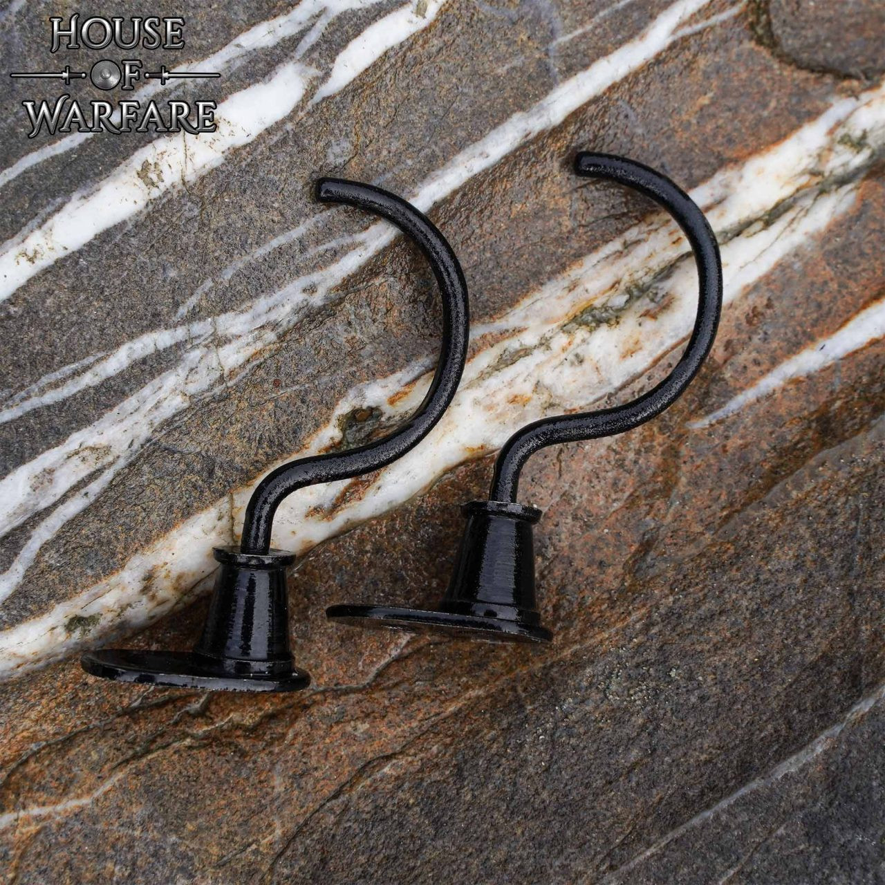 Questa coppia di supporti medievali offre una soluzione pronta per l'installazione, pensata per chi cerca un tocco medievale senza rinunciare alla sicurezza. La finitura nera conferisce discrezione ed eleganza, facendo risaltare i pezzi appesi senza competere con la decorazione. La curva a 'U' sostiene gli oggetti evitando scivolamenti, e la base con foro per il fissaggio garantisce un montaggio stabile su superfici verticali.