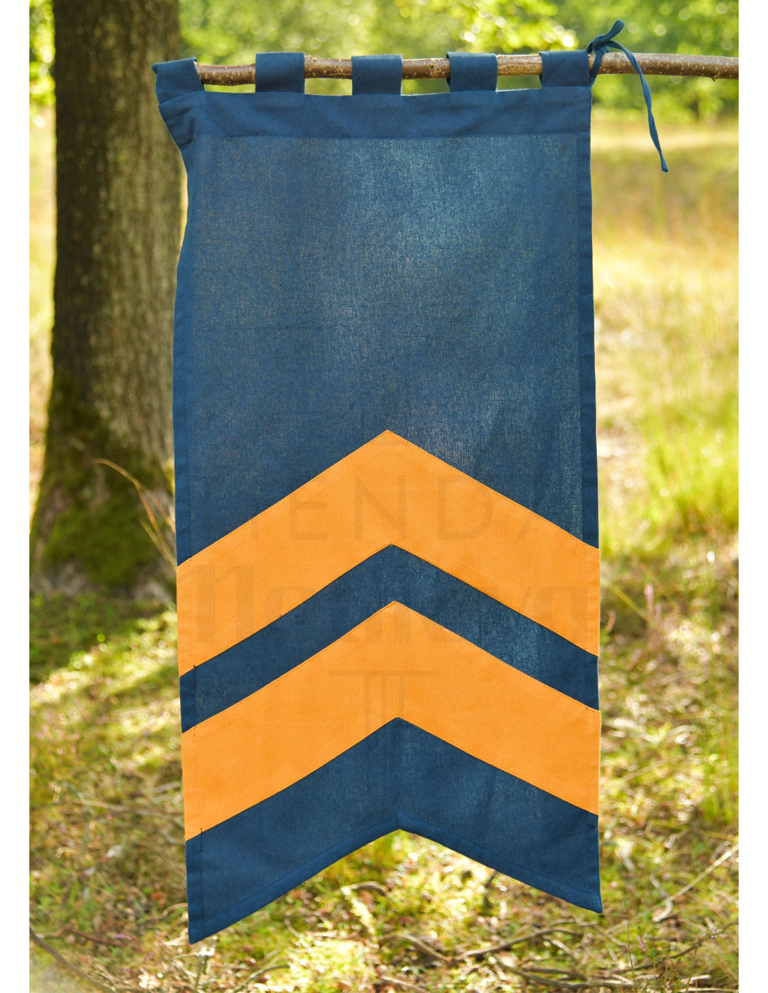 Con una base di un blu scuro profondo e due strisce a 'V' in tono caldo, questo stendardo offre una presenza visiva potente, capace di trasformare qualsiasi spazio in un punto di attenzione. La forma punteggiata nella parte inferiore segue il contorno delle strisce, apportando una finitura elegante che cade con grazia, mentre il tessuto 100% cotone offre una texture naturale e movimento, perfetto per essere esposto in interni a tema o in eventi all'aperto con carattere.