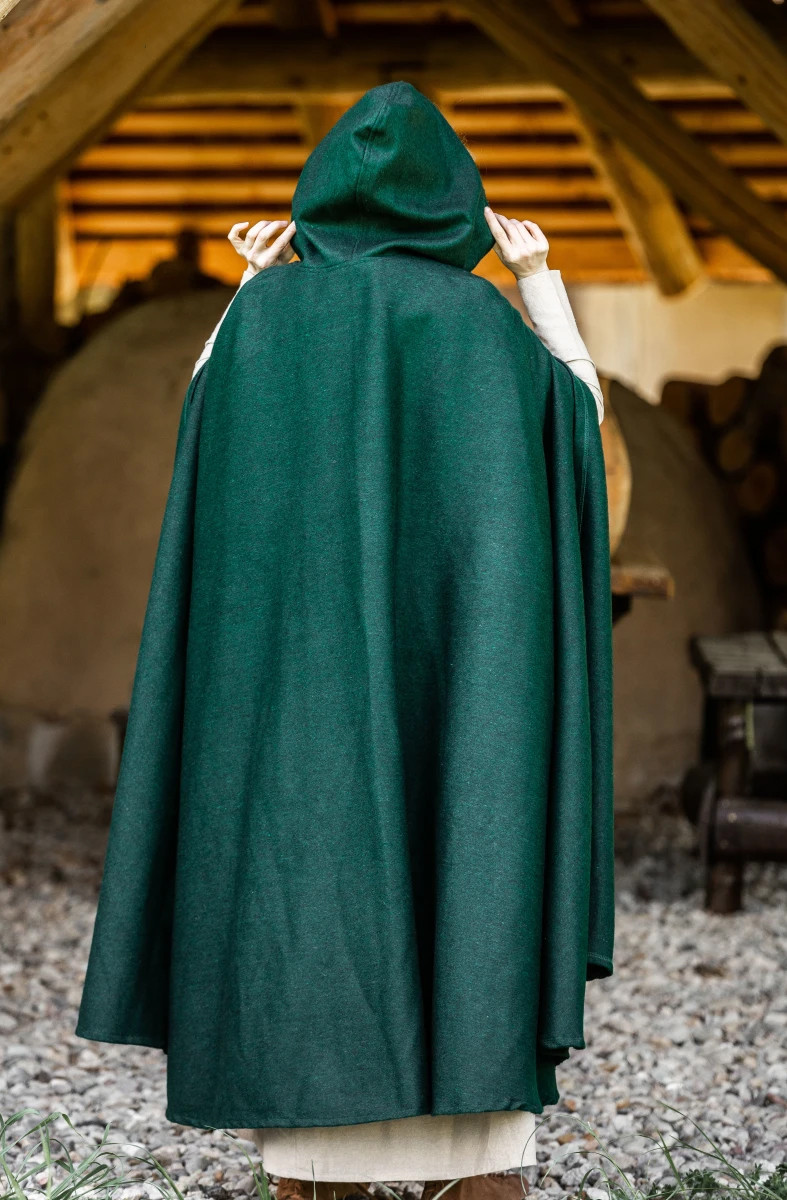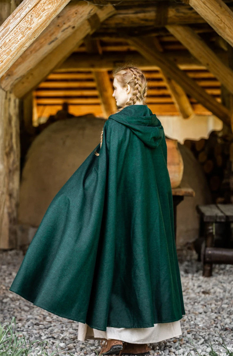 Immergiti nell'eleganza medievale con il mantello classico Elinor in verde! Questo mantello unisex, con il suo cappuccio corto, ti trasporterà ai giorni di cavalieri e fanciulle avvolgendoti in un'aura di stile e mistero.