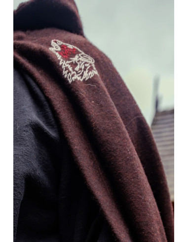 Mantello Alpha Viking con ricamo lupo, marrone