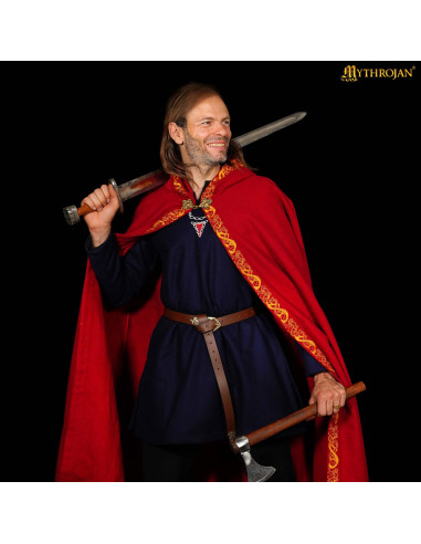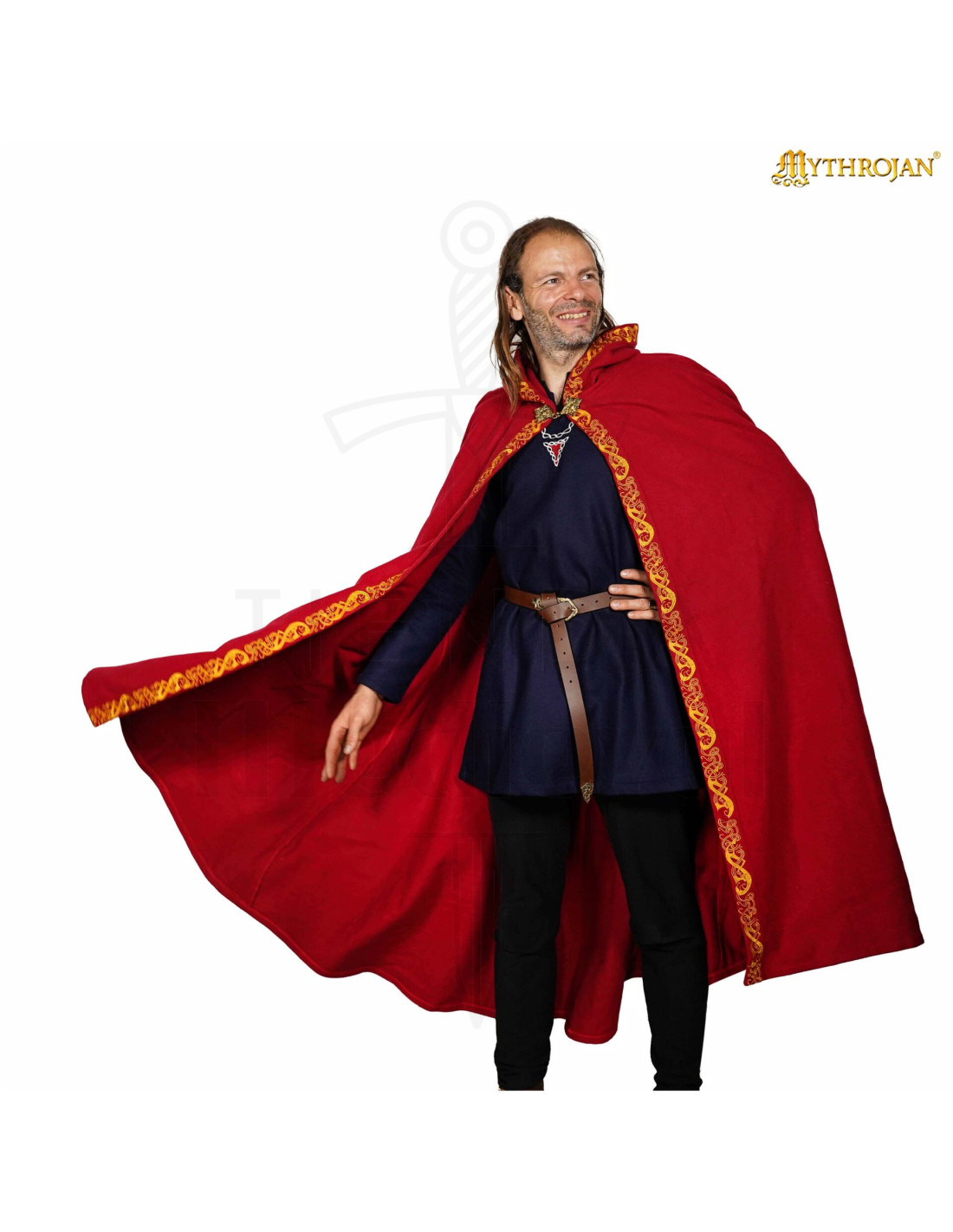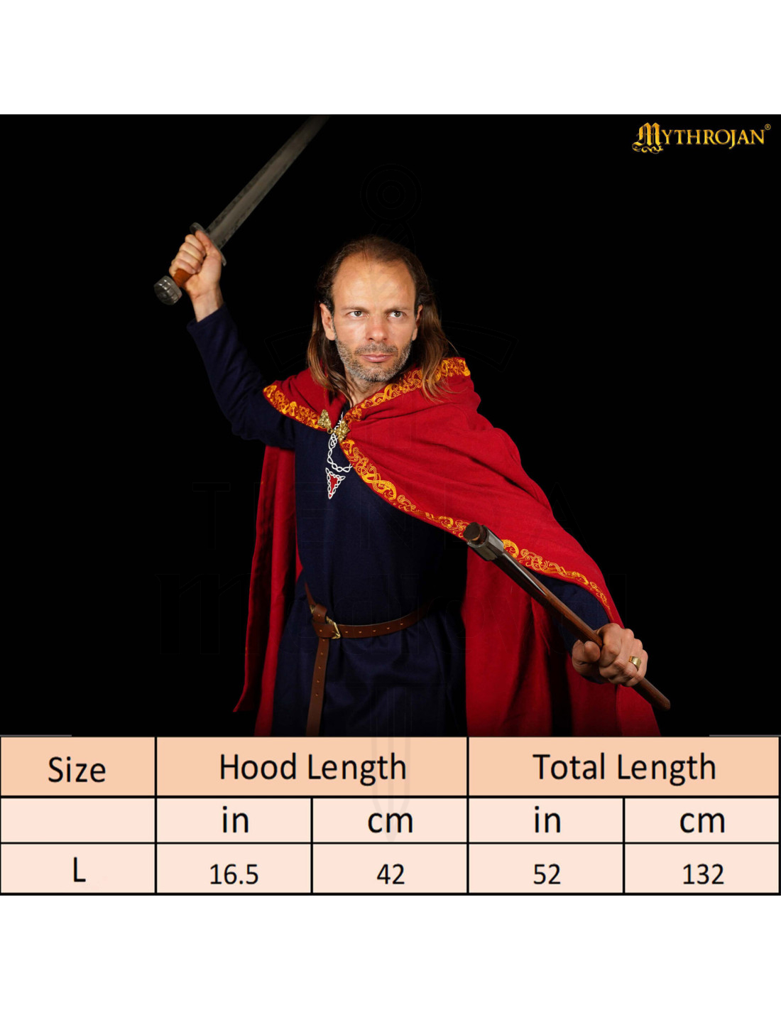Trasporta il tuo spirito medievale con questa cappa di lana rossa che evoca tutta la magia e l'eleganza dell'epoca. Con un ricamo decorativo sui bordi che ne esalta il carattere classico, questa cappa dal design completo e grande cappuccio ti avvolge in una presenza imponente e autentica, perfetta per eventi di LARP, fiere rinascimentali o matrimoni a tema.