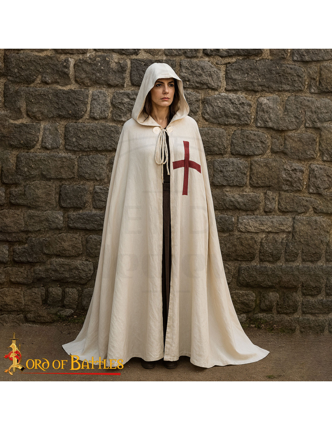La grande croce rossa sul petto non è solo un ornamento, ma un simbolo visivo che trasmette gerarchia e appartenenza, ideale per coloro che desiderano proiettare una figura riconoscibile e solenne nelle ricreazioni, nel teatro o negli eventi tematici. Il cappuccio profondo fornisce una copertura efficace, mantenendo il viso protetto e creando quella silhouette iconica di combattimento o cerimonia.