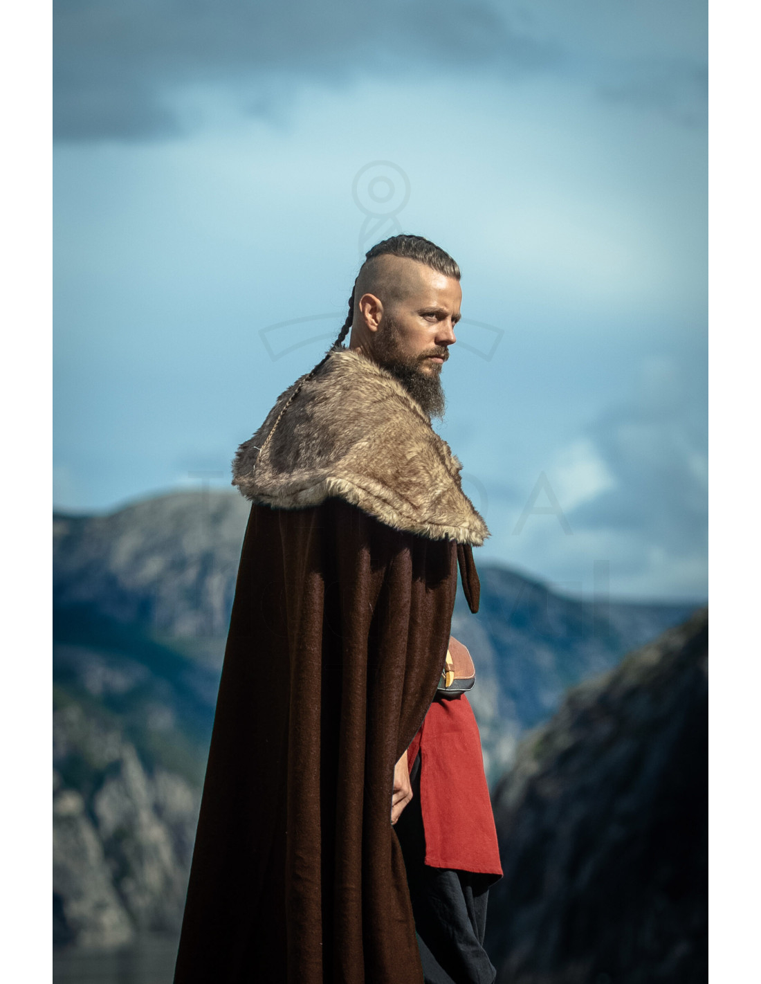 La Capa vichinga unisex modello Janne, colore marrone combina tradizione e funzionalità per chi cerca presenza senza complicazioni. Il suo taglio ampio crea una silhouette avvolgente, perfetta per proteggerti dal vento e dall'umidità leggera mentre mantieni libertà di movimento.