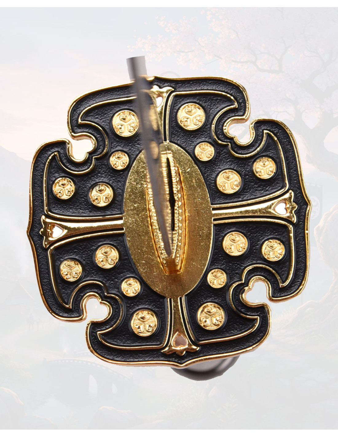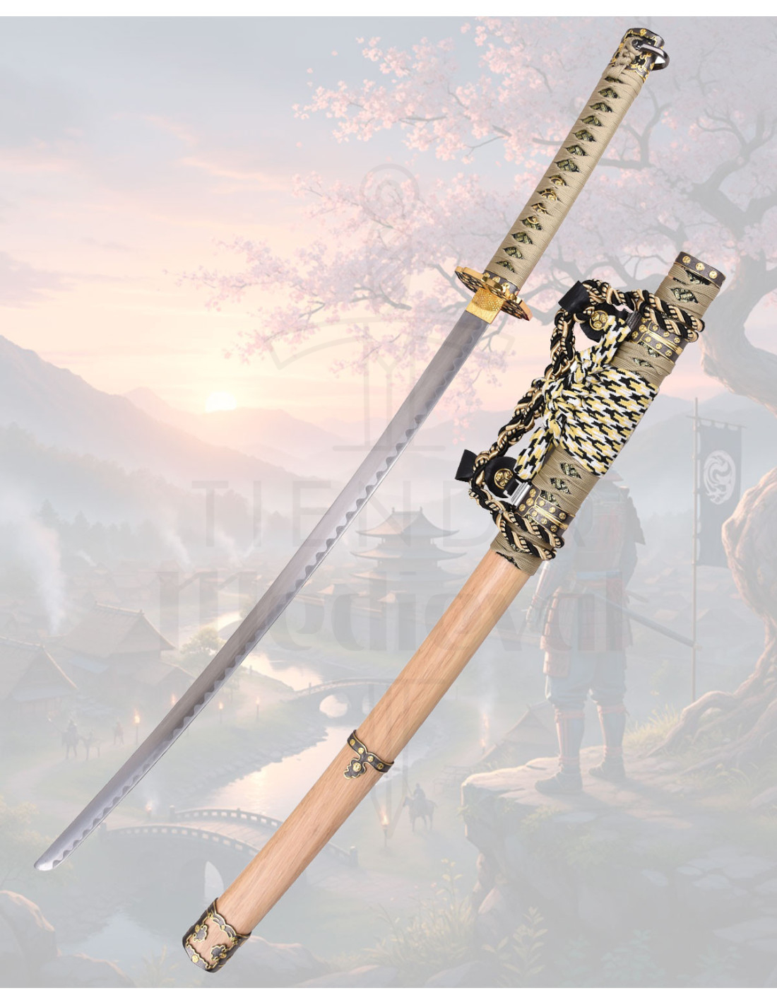 L'impugnatura, accuratamente intrecciata e decorata con tonalità beige, nero e dorato, offre una presa che trasmette autenticità e comfort ogni volta che la maneggi, mentre la guardia circolare dorata aggiunge un punto di distinzione che risalta lo stile classico. La corda intrecciata nella parte superiore del fodero non solo esalta la finitura estetica, ma permette anche di tenerla o appenderla in sicurezza, pensata per chi apprezza sia l'aspetto che la praticità.