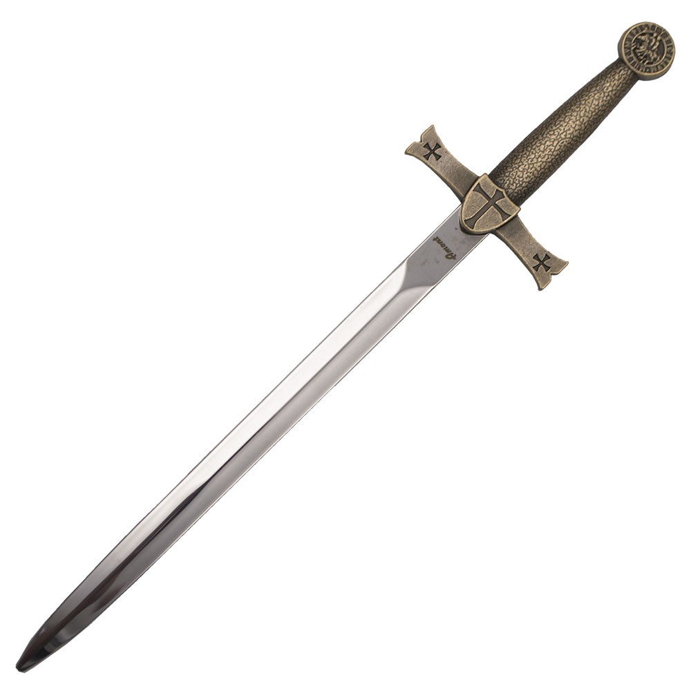 Massonica spade di Spada dei cavalieri Templari II con il pomo, la guardia e manico color bronzo. La dimensione totale è di 21 cm e viene presentata con un blister. La lama in acciaio 420.