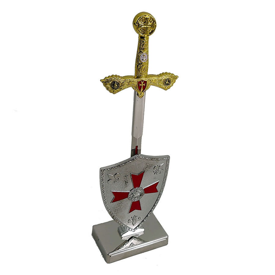 Set di tagliacarte d'oro dei Cavalieri Templari con supporto croce templare da tavolo.