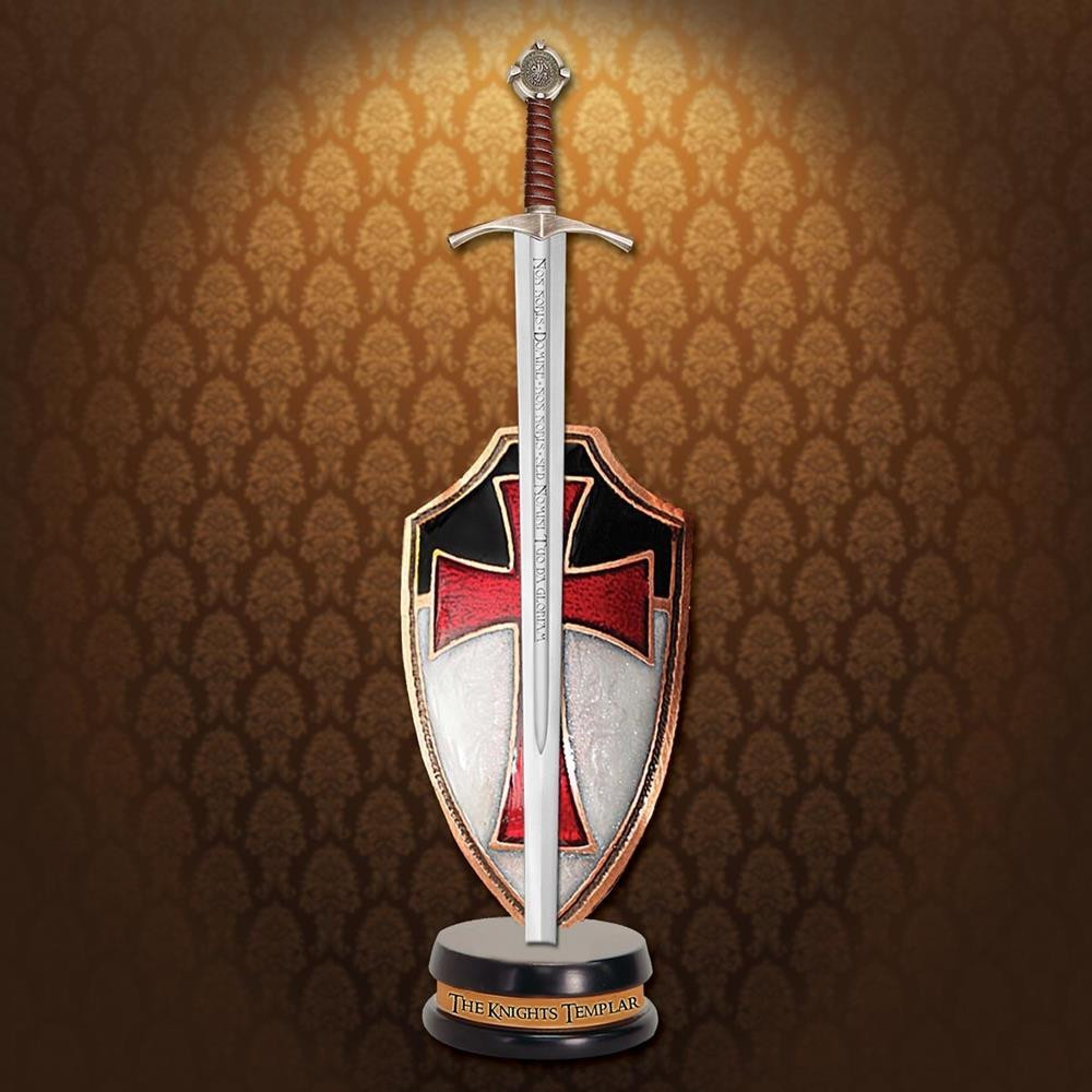 La spada tagliacarte, lunga 23 cm, è meticolosamente dettagliata per catturare l'essenza del coraggio e dell'onore dei Templari. Inoltre, il set comprende un leggio con un mini-scudo smaltato, decorato con lo stemma dei Templari su entrambi i lati. Questa caratteristica unica ti consente di esporre il pezzo secondo le tue preferenze, mostrando la sua bellezza da qualsiasi angolazione.