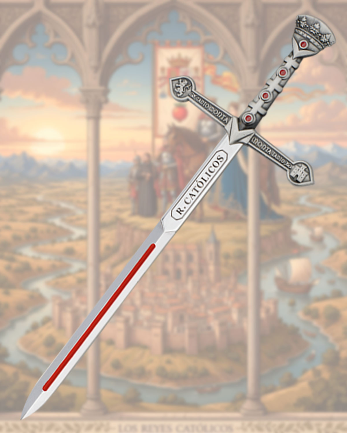 Questo pezzo ornamentale sfoggia una lucentezza argentata accentuata da dettagli rossi che creano un contrasto elegante e accattivante. La lama, lunga e dritta, mostra una striscia rossa centrale che guida lo sguardo verso l'iscrizione verticale 'R. CATTOLICI', un dettaglio che aggiunge carattere e autenticità storica. Il guardamano, a forma di croce, presenta incisioni sottili lungo le sue braccia, conferendo un'aria simmetrica e raffinata, mentre il pomolo decorato con inserimenti rossi conclude il pezzo con un accento visivo che armonizza con il manico.