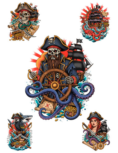 Cerchi un tocco divertente e audace senza impegno? Questo tatuaggio temporaneo a tema pirata a colori farà navigare il tuo stile in nuove avventure. Perfetto per dare un aspetto deciso a feste, eventi o semplicemente per distinguerti tra gli amici, il suo design vibrante e dettagliato su un foglio di formato A4 garantisce un impatto visivo su qualsiasi zona del corpo.
