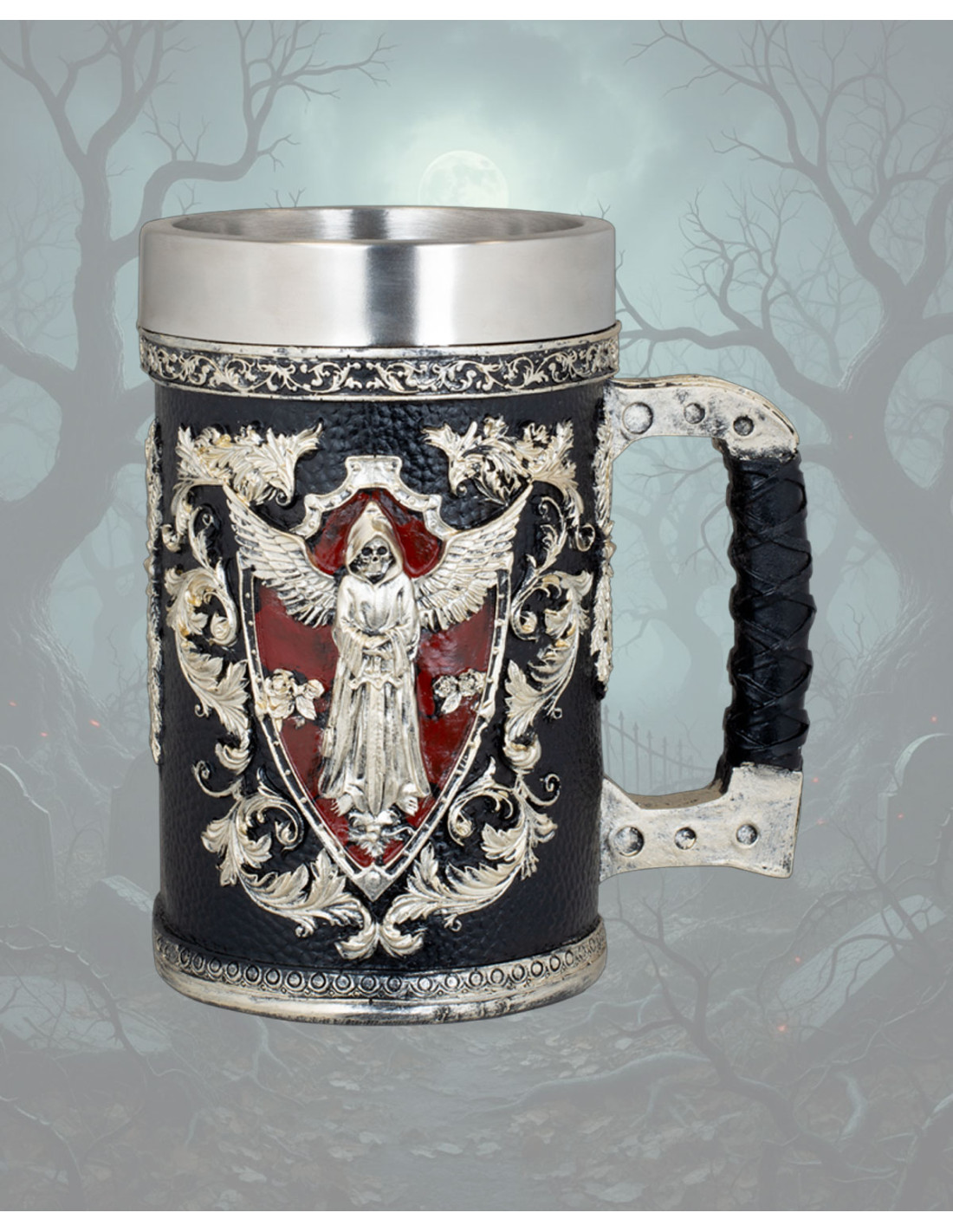 Questo pezzo dal design elaborato combina un'estetica gotica con una presenza teatrale, diventando il centro dell'attenzione sia in una collezione che su una tavola a tema. Il corpo presenta uno scudo in rilievo con una figura incappucciata, ali spiegate e uno sfondo rosso, dettagli che offrono una narrativa visiva potente, ideale per chi ama il dark e l'elegante.