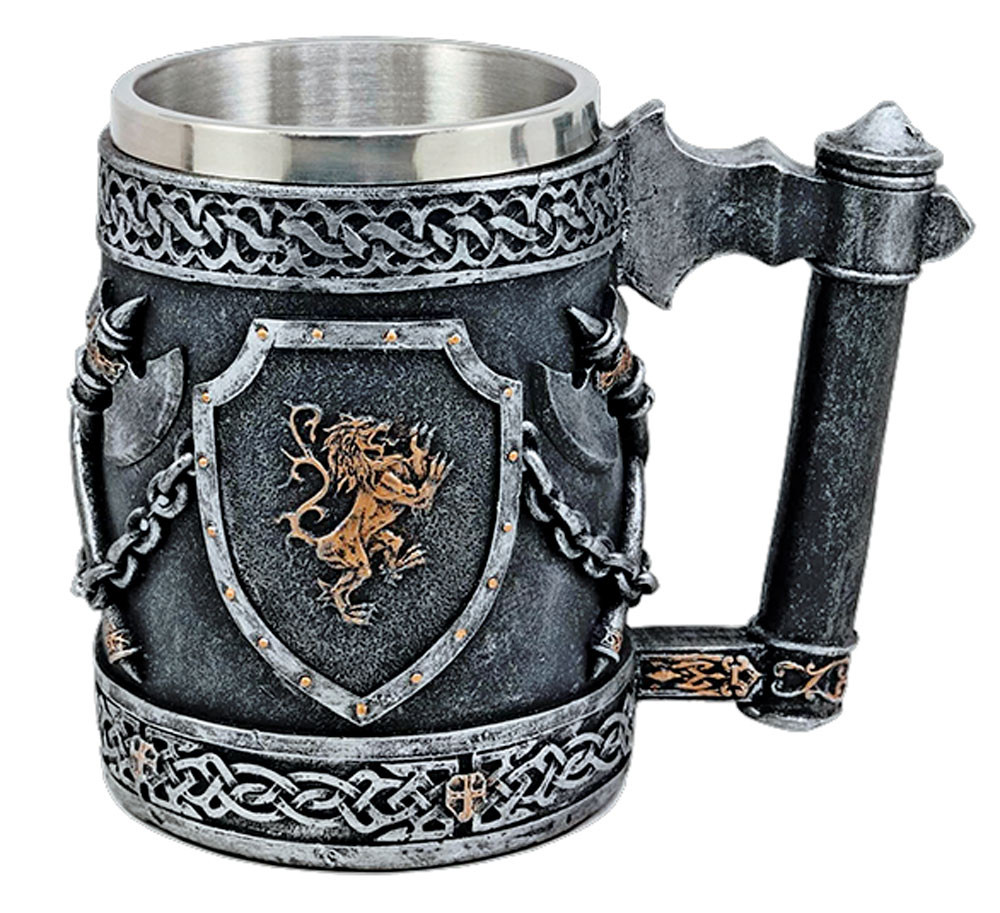 Richiesta su Tazza medievale ornamentale in resina con design di asce e scudi