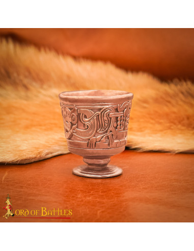 Le fini scene di grappoli d'uva e il minuzioso arabesco inciso sulla superficie si traducono in un'attrattiva visiva che arricchisce qualsiasi altare o vetrina, mentre l'iscrizione in arabo situata all'interno aggiunge una dimensione spirituale e poetica, perfetta per rituali intimi o come pezzo di contemplazione. Il bordo leggermente flare facilita la maneggevolezza e la base elevata assicura stabilità e protagonismo quando viene esposta.