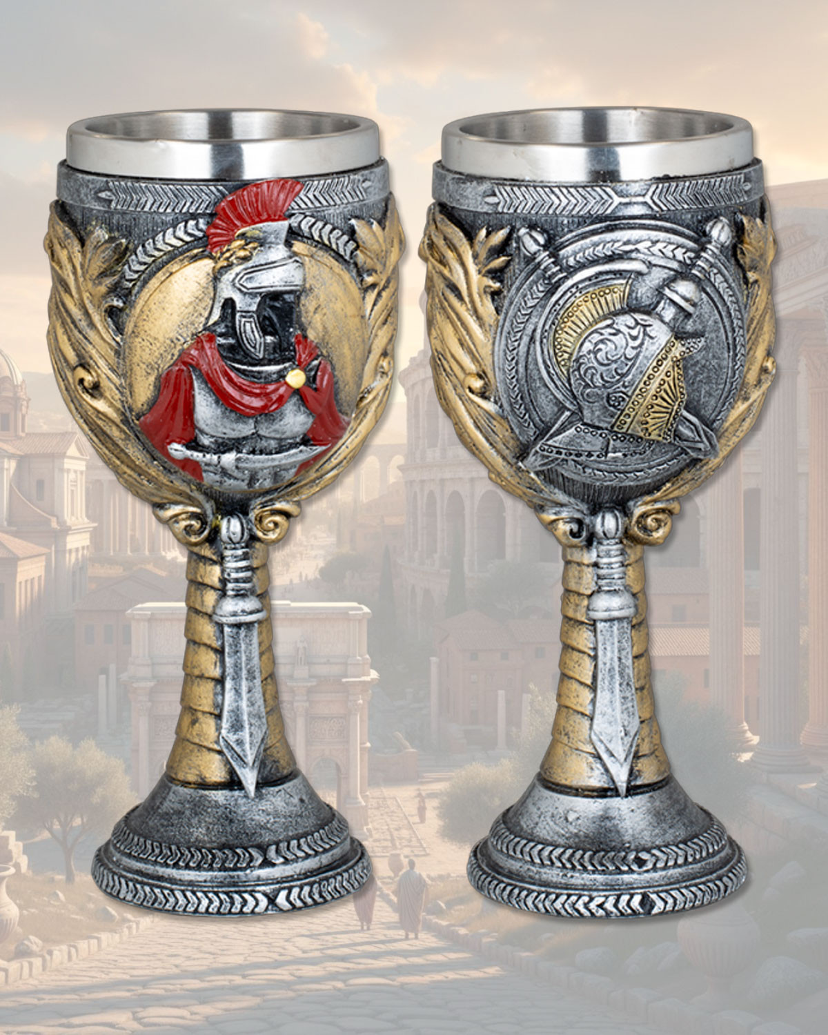 I motivi in rilievo, con busti di guerrieri, elmi, scudi e allori, raccontano una piccola storia da ogni angolazione. Vedrai la cresta rossa dell’elmo e la fibbia dorata che suggeriscono onore e vittoria, mentre la base, ispirata alla forma di una foglia e impugnatura, conferisce stabilità e un dettaglio inaspettato che stimola la conversazione.