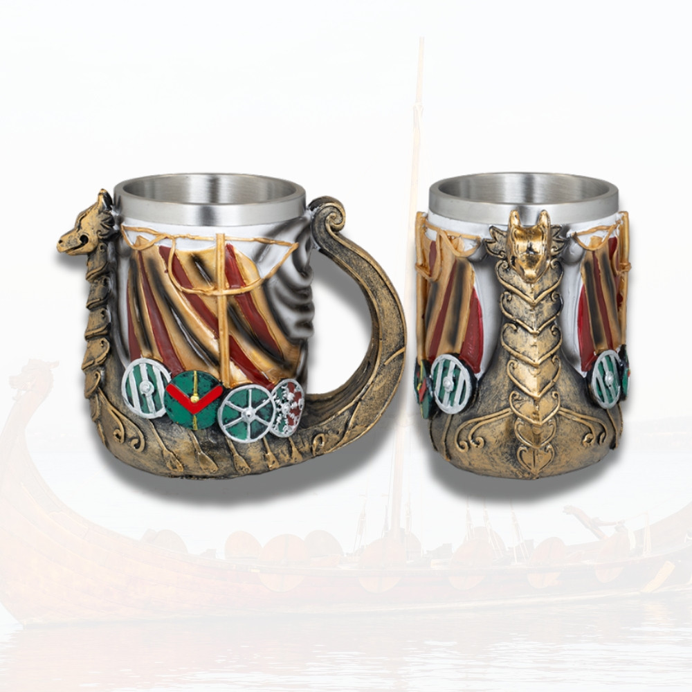 Realizzata con un interno in acciaio inossidabile, questa tazza garantisce durata e resistenza alla corrosione, rendendola il compagno perfetto per le tue avventure quotidiane. Il suo design esterno, che imita la forma di una nave vichinga, è un omaggio all'estetica di un'era leggendaria. Con un drago scolpito nel manico, ogni sorso ti trasporterà in un mondo di miti e leggende.