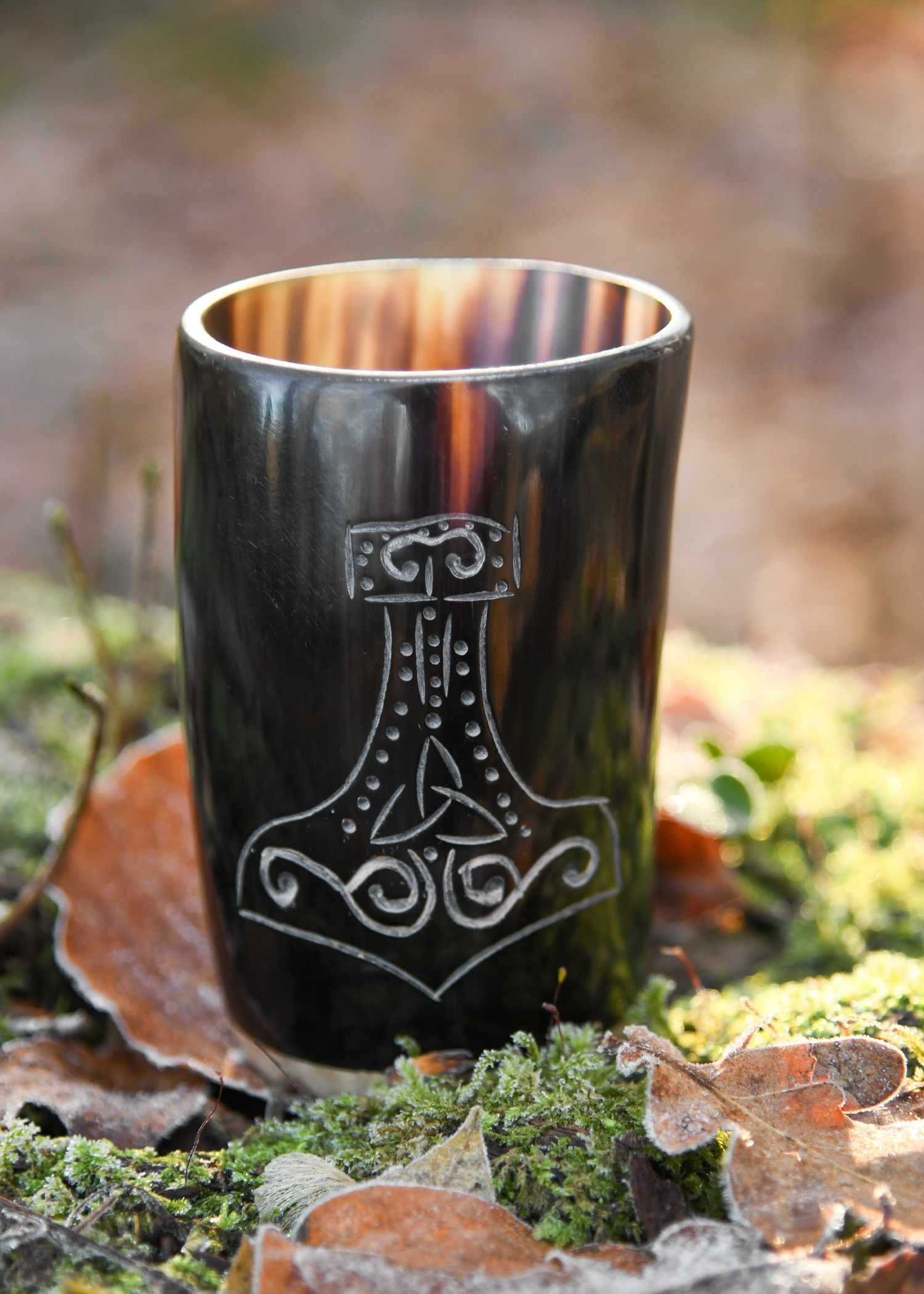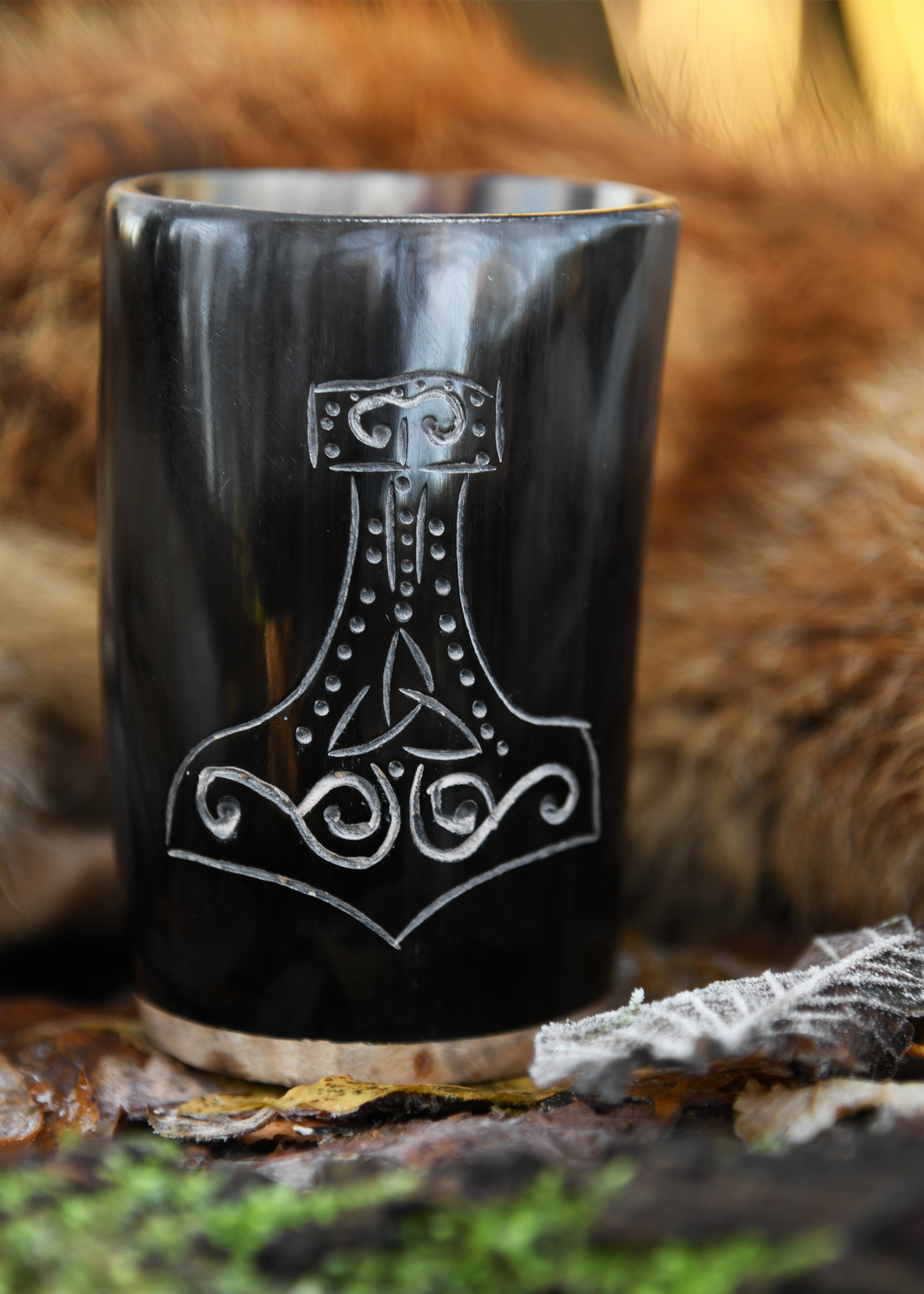 Il design meticolosamente inciso non solo abbellisce la coppa, ma racconta anche una storia ricca di mitologia. Mjölnir, simbolo di forza e protezione, è stato venerato nei secoli, e ora puoi portarlo con te in ogni brindisi. Che si tratti di una fiera medievale o del comfort della tua casa, questa coppa diventa il centro dell'attenzione, aggiungendo un tocco autentico a qualsiasi tavolo.
