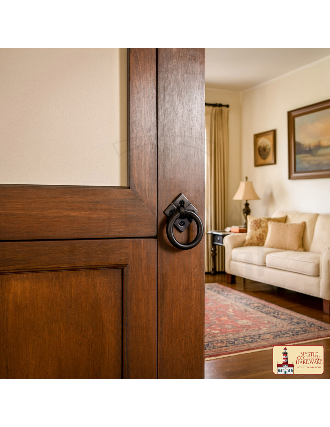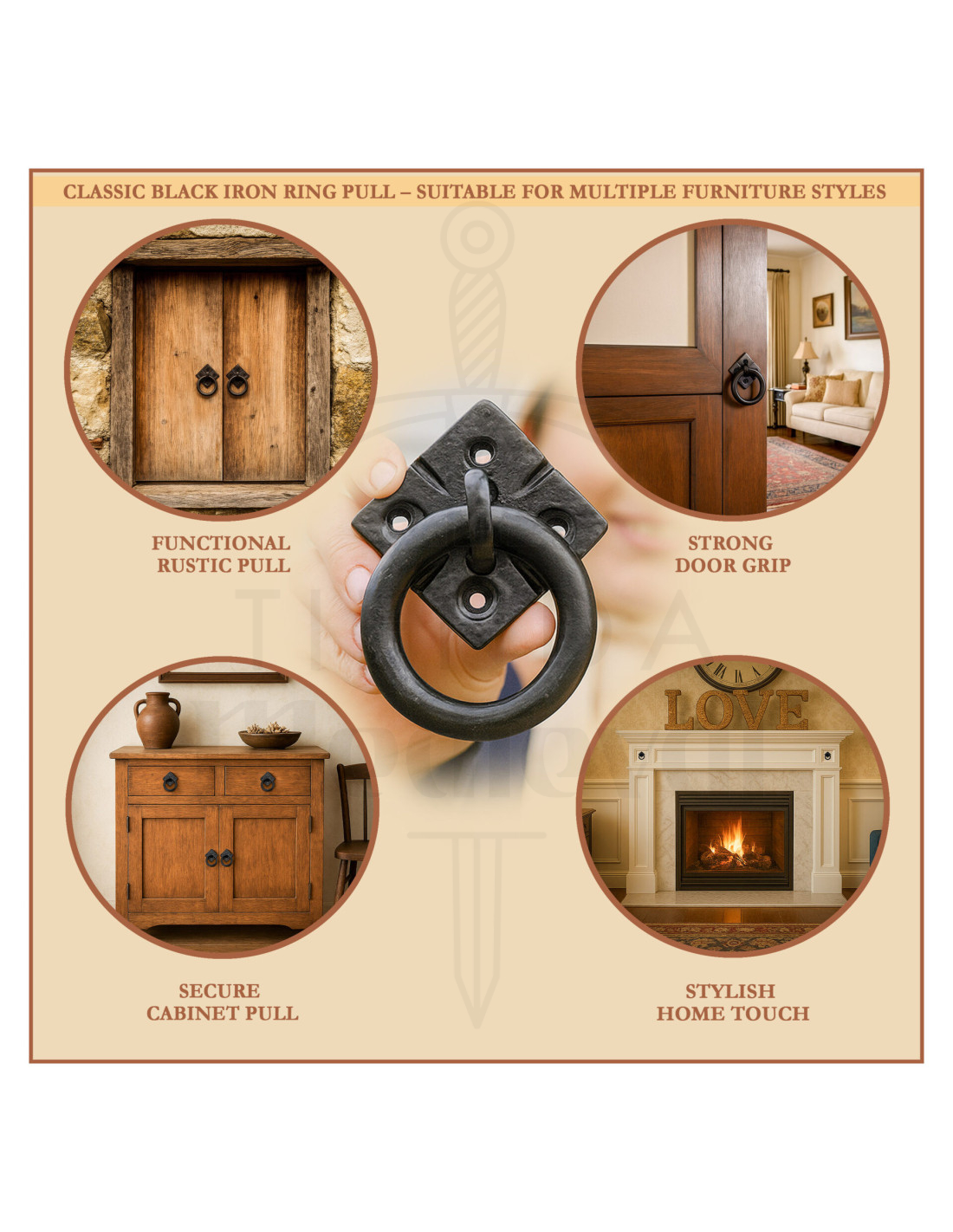 Il design combina un anello spesso e robusto con una base quadrata decorata con chiodi a vista e un rilievo semplice, dettagli che si adattano in modo naturale sia a porte in legno scuro con venature marcate che a mobili restaurati. Nell'immagine si può vedere come appare su una porta con modanature, apportando presenza senza risultare carico.