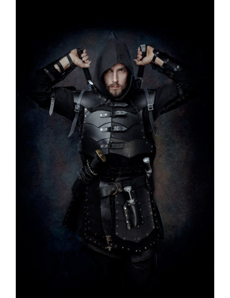 Le fasce frontali in pelle nera, modello Rasmus, offrono un equilibrio perfetto tra presenza e usabilità. La base in suede morbido accarezza l'anca, evitando sfregamenti e migliorando la sensazione mentre cammini o agisci, mentre le lastre sovrapposte proteggono con disinvoltura, seguendo ogni giro senza limitare la mobilità.