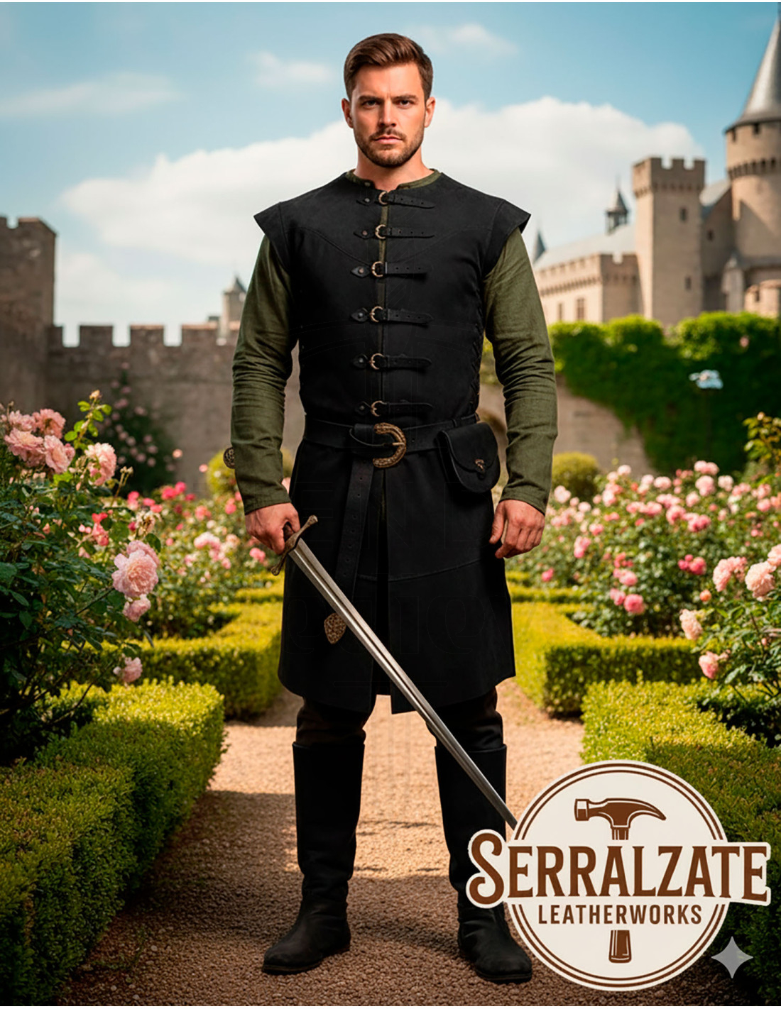 Scopri la tunica medievale Baldomero in nero, un capo unico progettato da Serralzate LeatherWorks che combina funzionalità e stile classico con la massima qualità artigianale. Realizzata con cura in Spagna, questo pezzo offre tutto ciò di cui hai bisogno per distinguerti in eventi di ruolo dal vivo, fiere medievali o qualsiasi attività ispirata all’epoca.