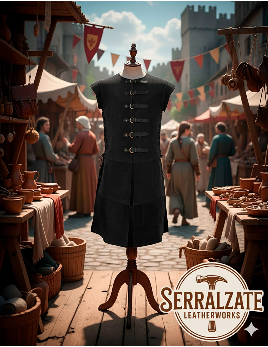 Ogni dettaglio, dalle cuciture visibili ai pannelli strutturali nella parte inferiore, è progettato per offrire resistenza e un'aderenza elegante. Come tutti i prodotti di Serralzate LeatherWorks, la tunica Baldomero si distingue per il suo design distintivo e la cura del dettaglio, rendendola un capo imprescindibile per ogni amante dell’estetica medievale.